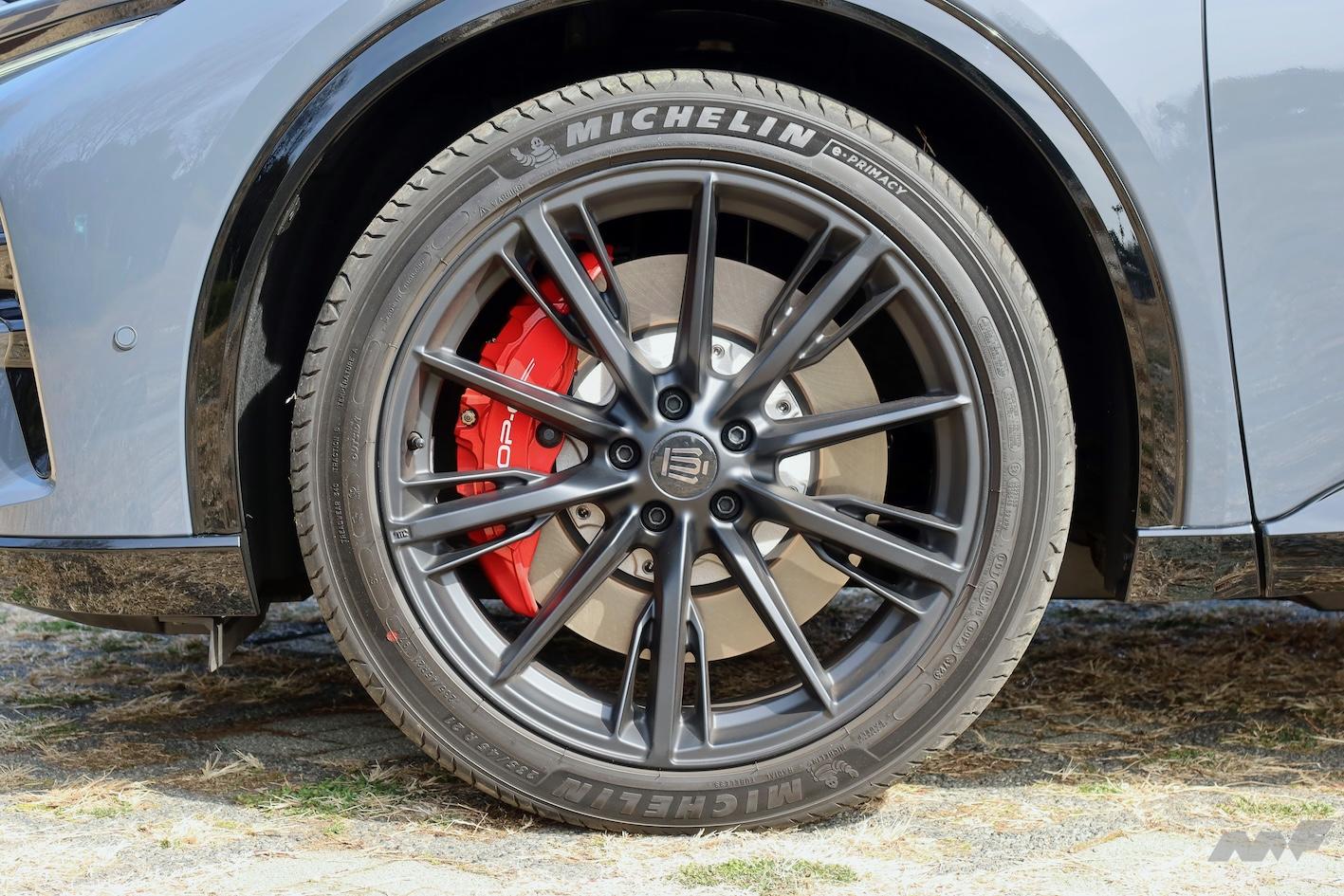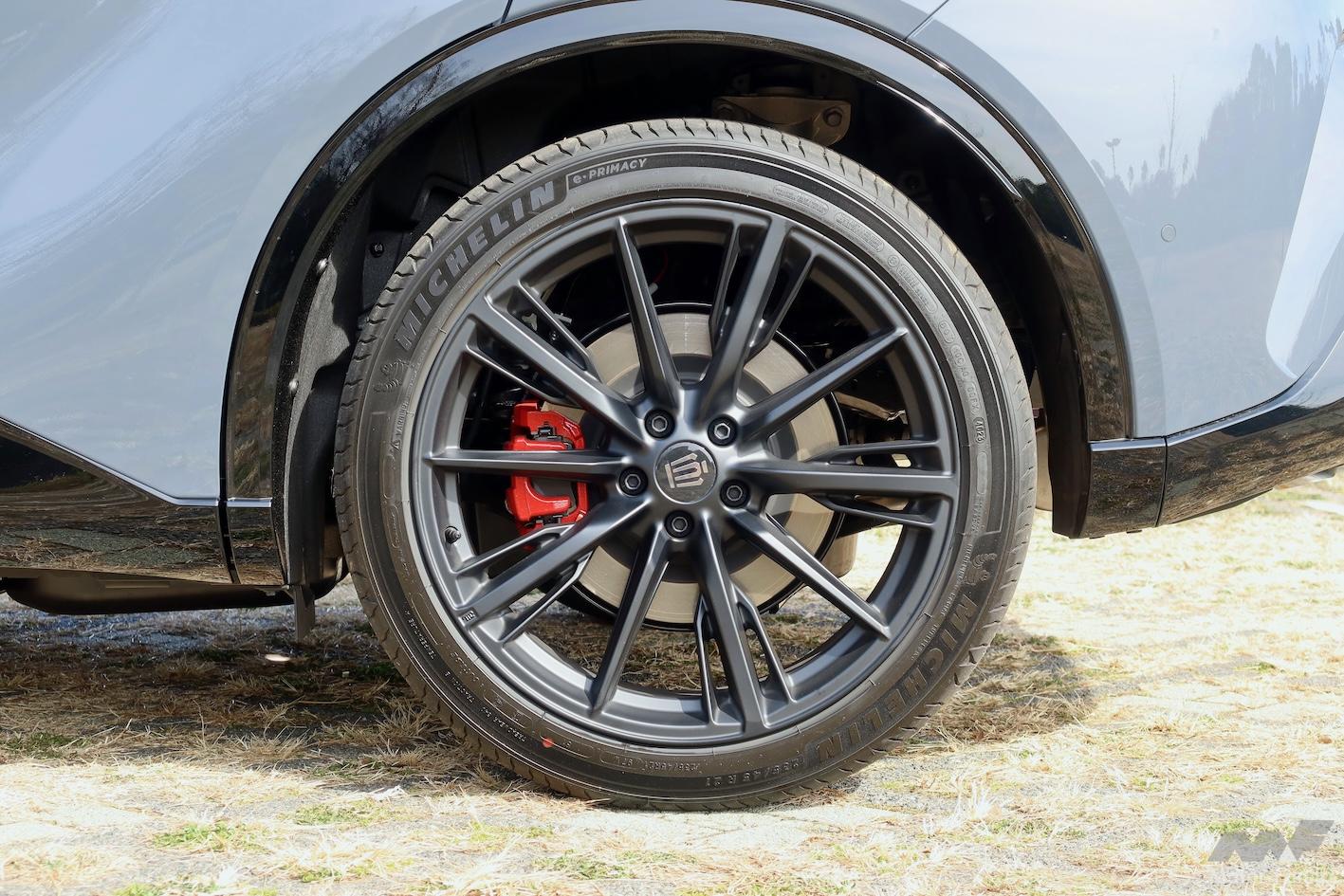 マットブラック塗装のPHEV専用ホイールからは(2.5Lハイブリッド車はグロスブラック塗装)、赤く塗装されたアルミキャリパーが覗く。「OP-6」は、「対向6ピストン」の意味だ。もちろん色だけが特色ではなく、ストッピングパワーが高められている。