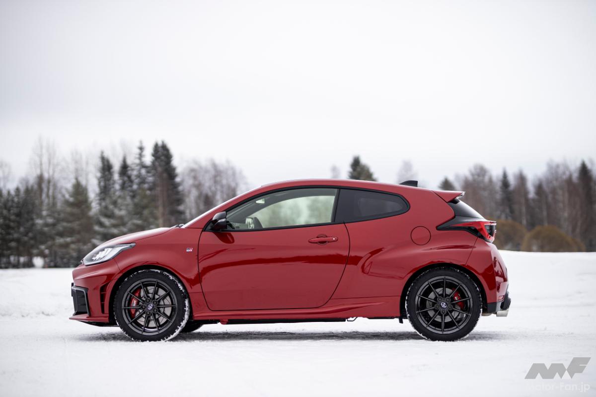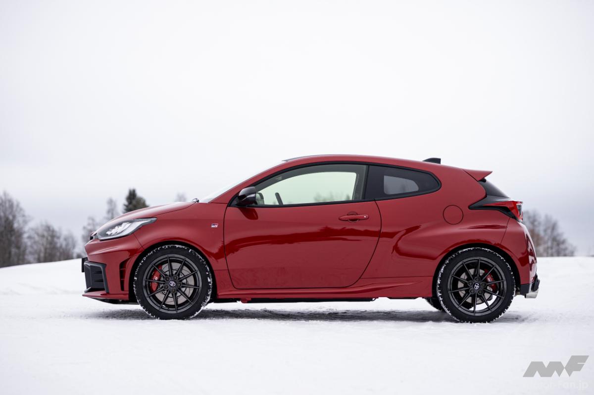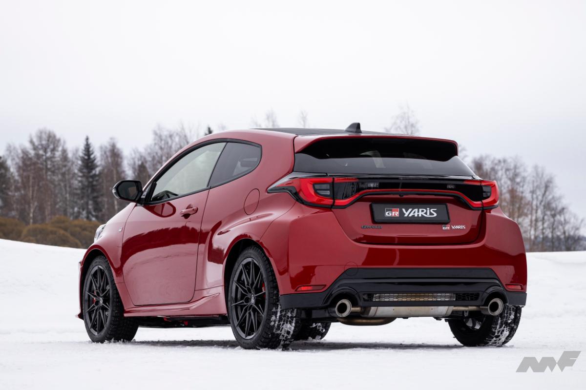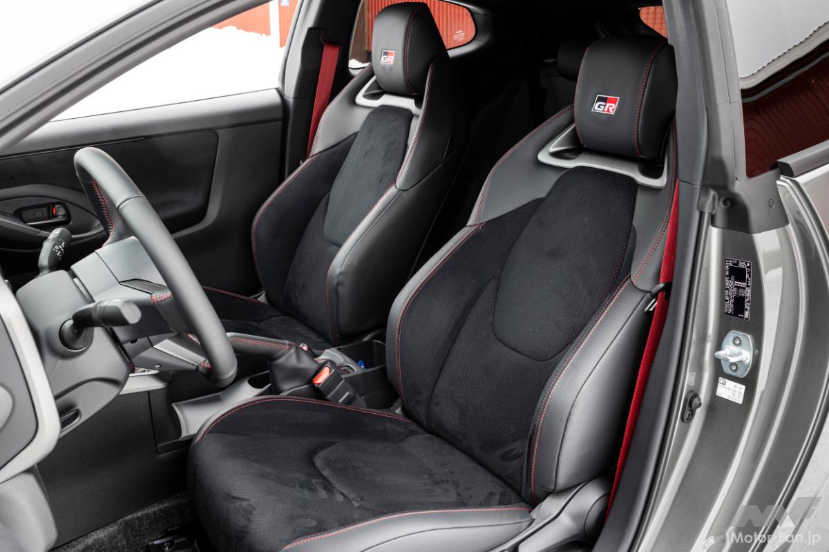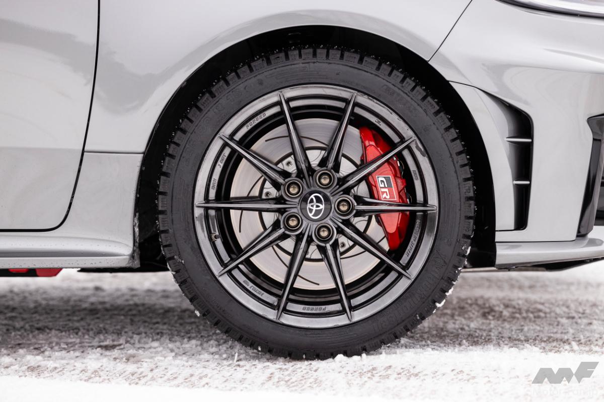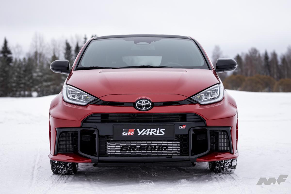 GRヤリスの軽量ボディは、スポット溶接を約13%増やし、構造用接着剤を約24%増量することで、剛性をさらに高めている。その結果、ヨーレスポンス、ステアリングフィードバック、グリップフィールが向上し、もともと張りのある、乗り応えのあるシャシーに仕上がっている。フロントはマクファーソンストラット、リアはトレーリングアーム付きダブルウィッシュボーンという軽量かつ高剛性なサスペンションシステムはそのままに、競技ドライバーからのフィードバックを受けて調整が行われた。