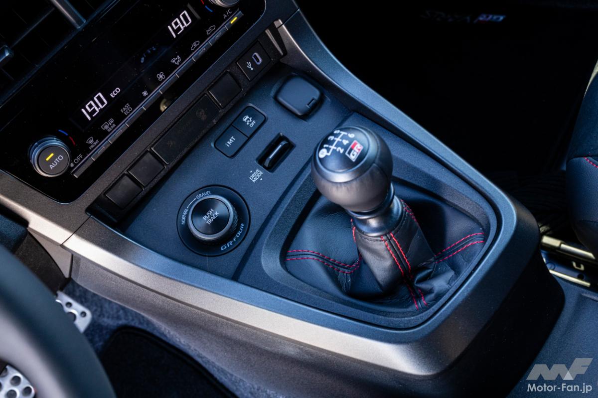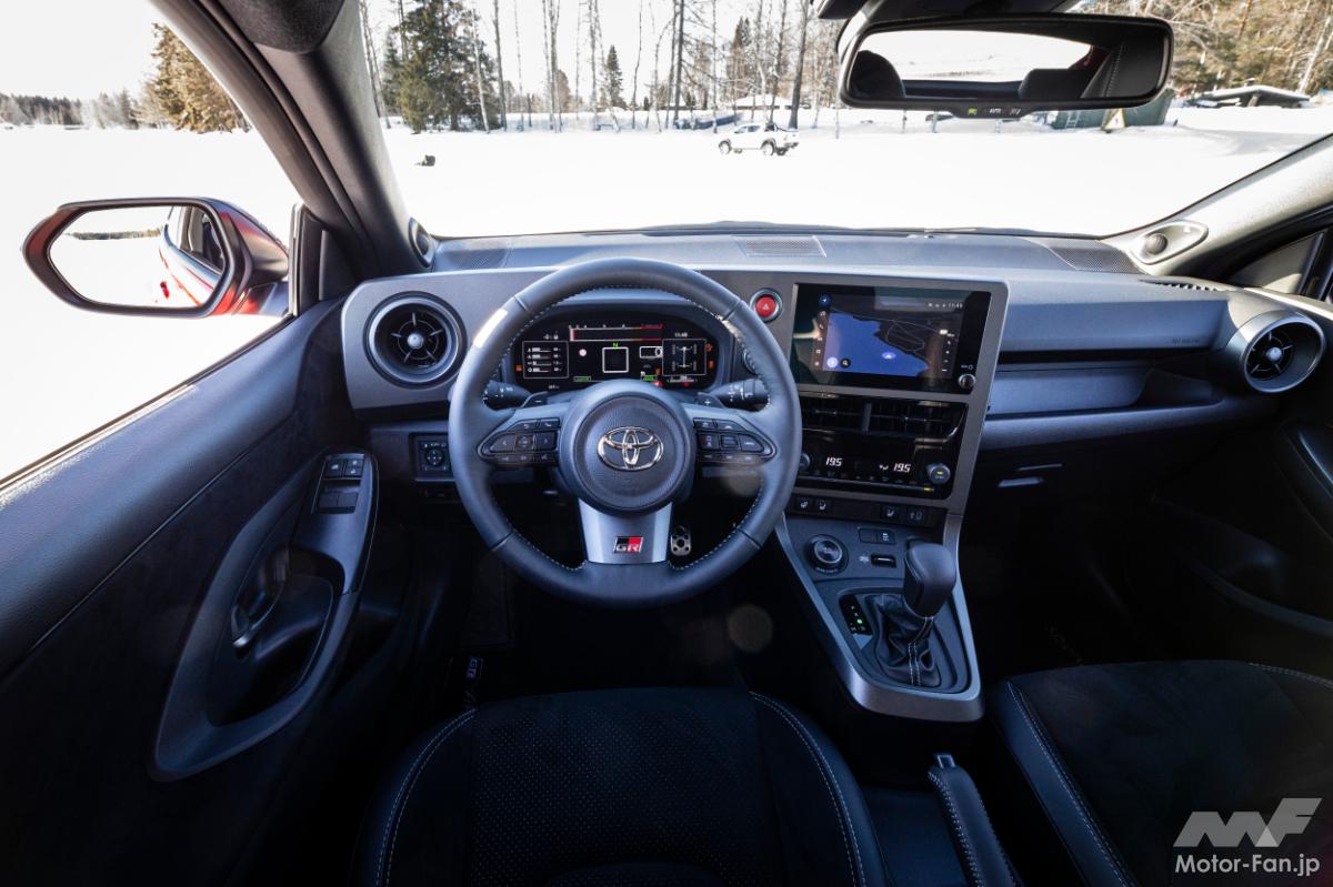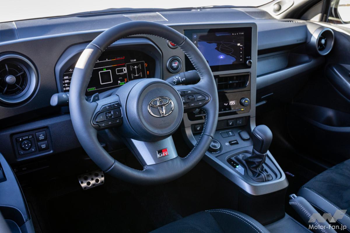 ドライバーズコックピットは、GRヤリスの特徴である “ドライバー・ファースト “の原則に忠実なデザインで、正真正銘のスポーティさを感じさせるよう、大幅に変更された。インタークーラー噴射、VSC-OFF、ハザードランプなど、競技走行でよく使う操作系はドライバーの近くに移動させ、レーシングハーネスを装着していても素早く簡単に手が届くようにされた。インストルメントパネルの上端を50mm下げ、バックミラーの位置を変更し、コントロールパネルの角度を15度ドライバー側に向けることで、ハンドルからのドライバーの視界が改善されている。