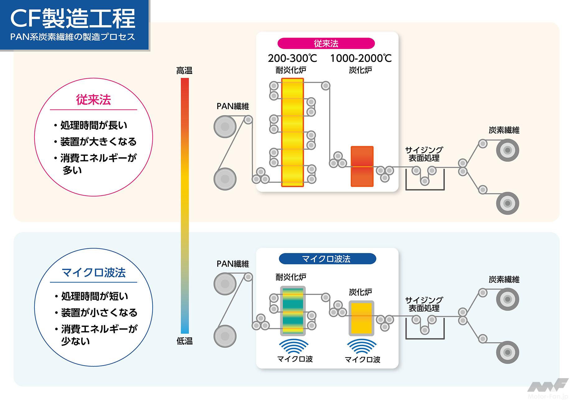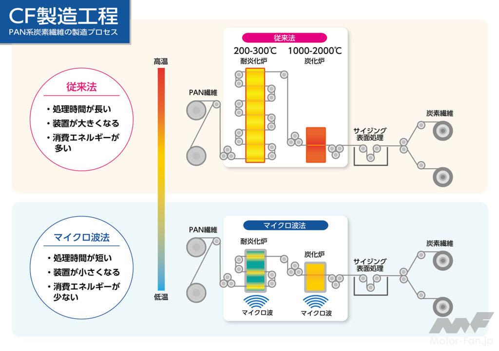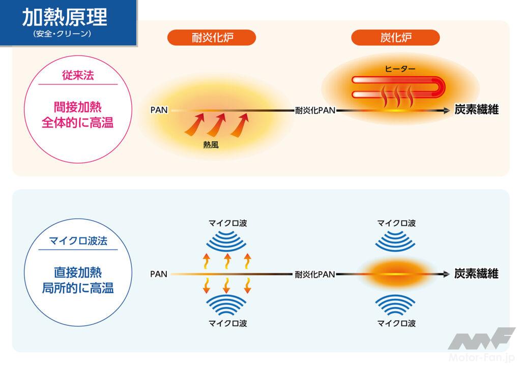 本技術は、CF製造工程中で最もエネルギー消費の大きい耐炎化プロセスに加え、炭化プロセスの両工程を一貫してマイクロ波により焼成する革新的なもの。従来法と比較し、エネルギー消費量が50%削減され、処理時間も大幅に短縮し、装置をコンパクトにすることができる。また、再生可能エネルギーを使用することでより大幅なCO2排出削減が期待できる。その技術検証をさらに進めるために、実証設備の導入についても検討が進められる。