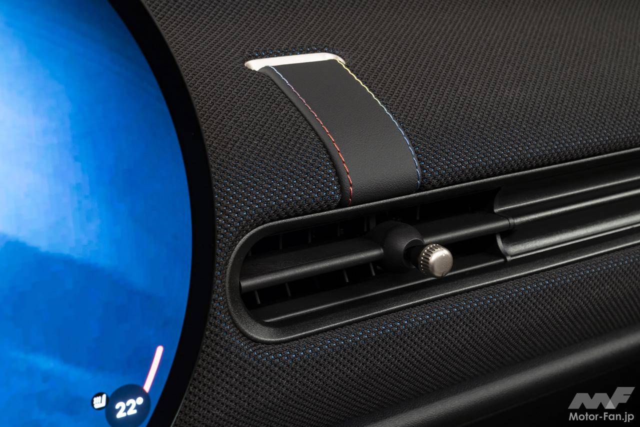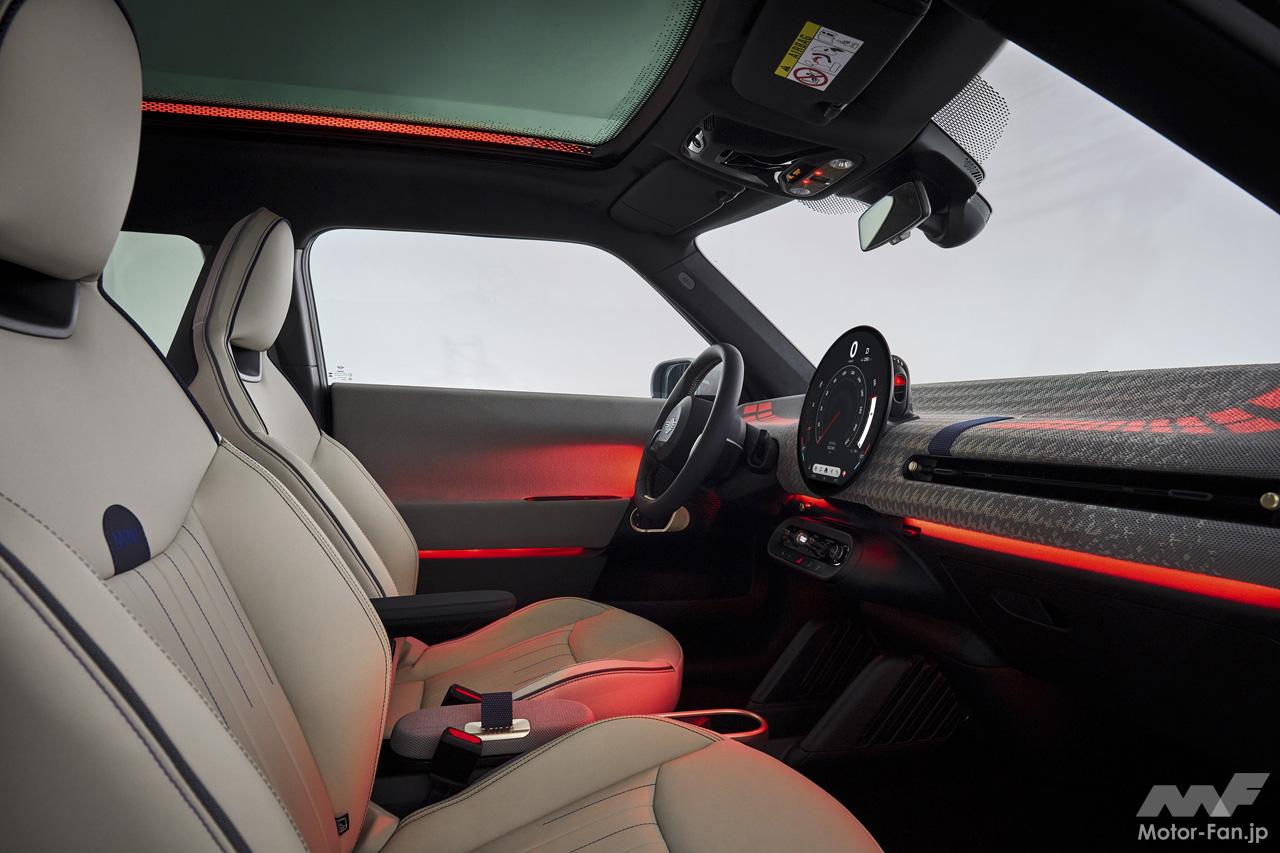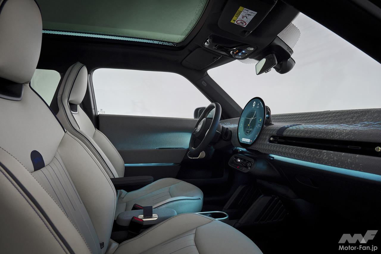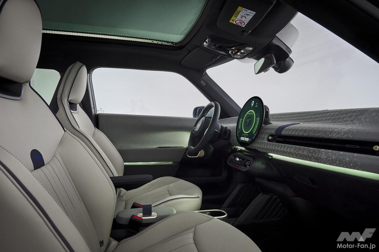 新しいMINIのデザイン言語におけるもうひとつの中心的な要素は、持続可能性を考慮した素材の選択だ。すべてにおいて刷新された内外装デザインは、新型モデルであることを彷彿とさせており、さらに、素材からクロームパーツやレザーを排除し、その代わりに採用した新素材にはリサイクル・ポリエステルやリサイクル・アルミニウムを利用するなど、将来を見据えた新世代モデルであることを主張している。