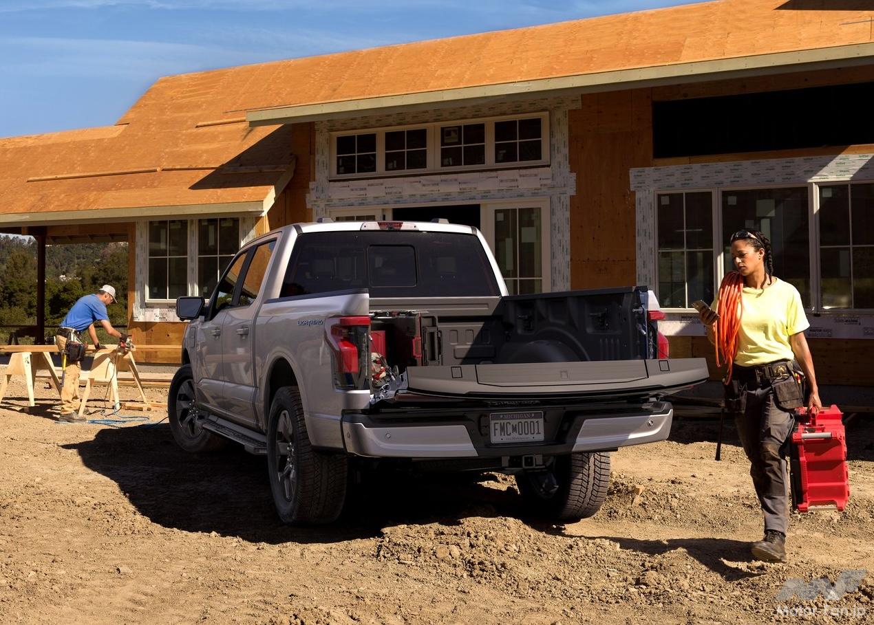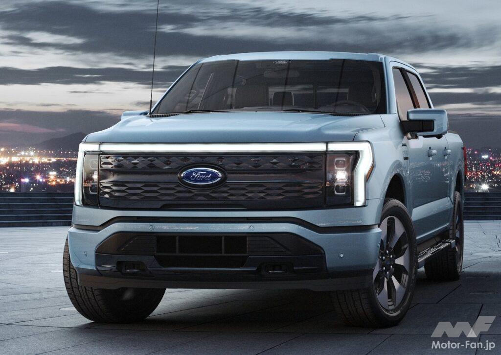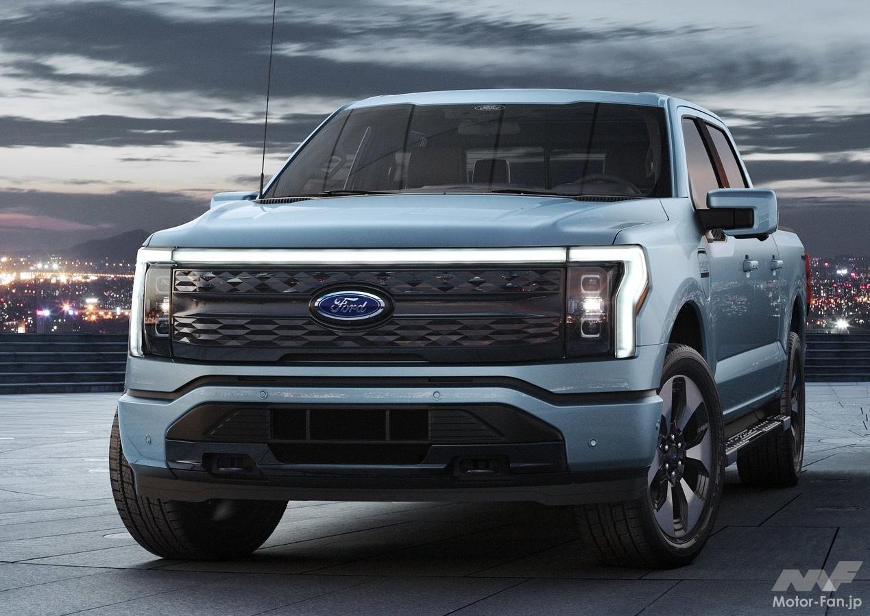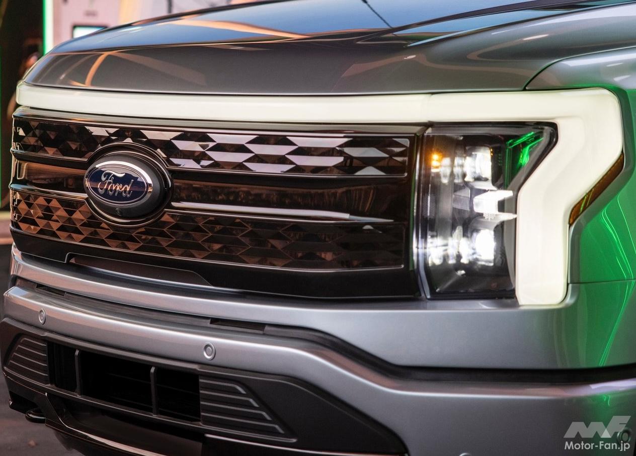 F-150ライトニングは、2022年のデトロイトモーターショーで公開された、ブランド初となるEVピックアップ・トラックだ。内燃機関エンジンを搭載する「F-150」とは異なるデザインを採用、フロントエンドのLEDライトバーが特徴となっているほか、空気抵抗を減らすようフロントエンドが新設計されている。