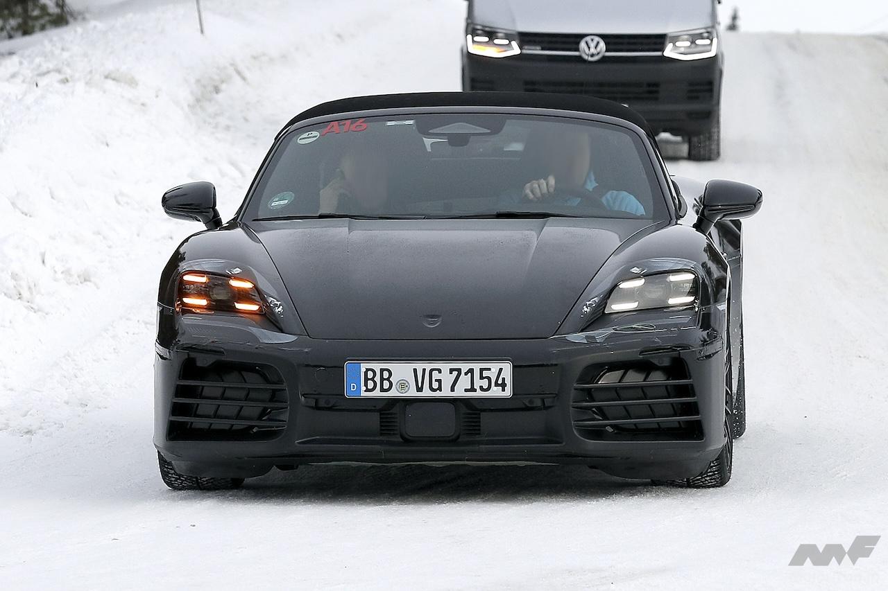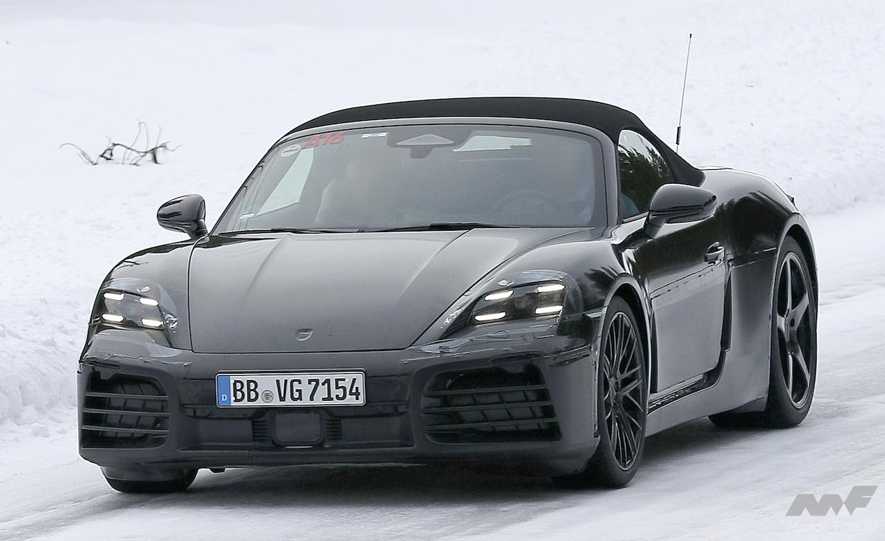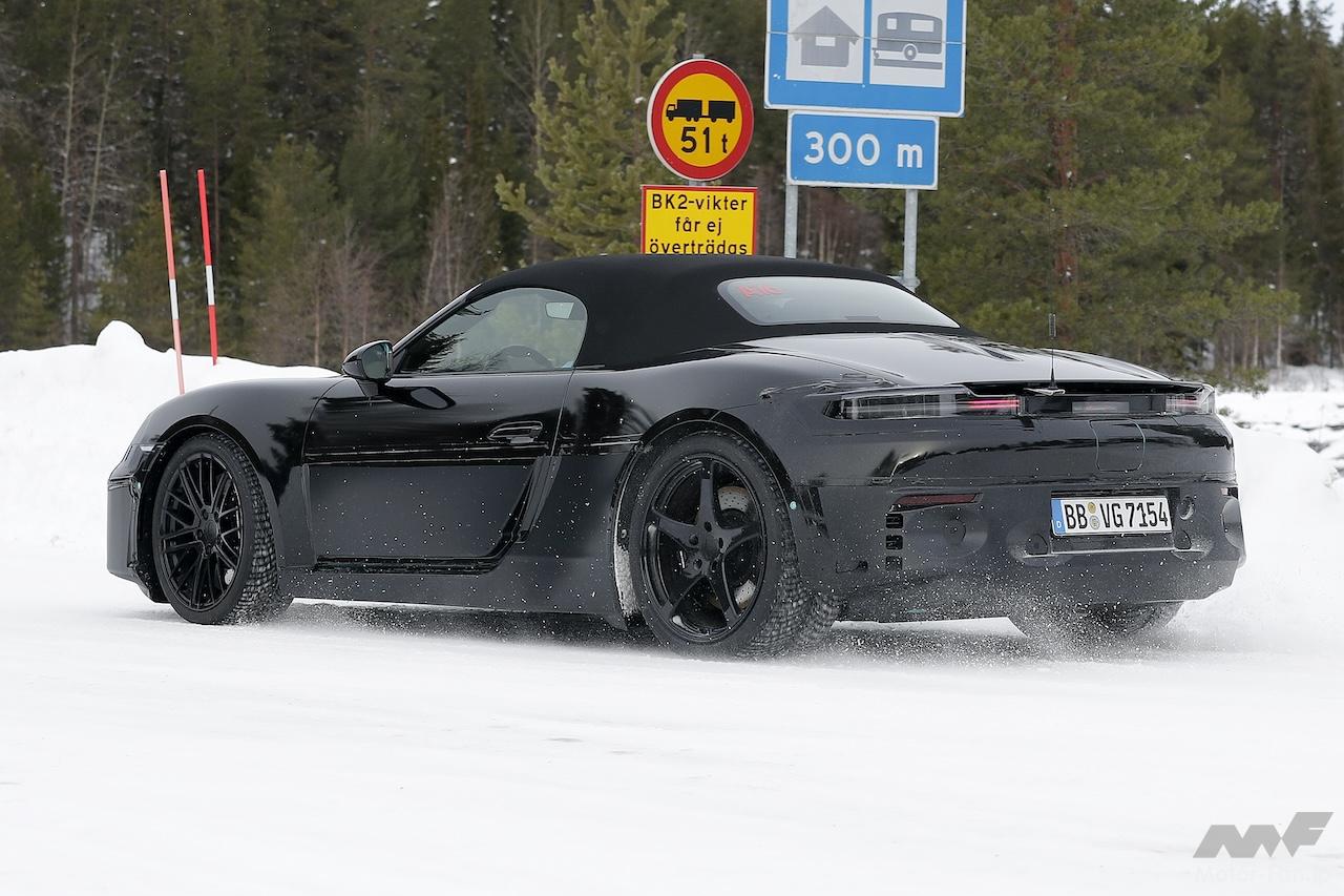 後部では、スリムなサードブレーキライトもはじめて点灯している模様が捉えられた。また、各リヤクォーターパネルを包み込むスリムなLEDストリップの形状の量産テールライトが装備されている様子が窺える。ポルシェが全幅ラップアラウンドLEDライトバーを備えた「GT3 Rレンシュポルト」を発表したばかりで、すでに「718ケイマンGT4 E パフォーマンス」EVレーサーにも採用されていることを考慮すれば、ボクスターにも同様のものが搭載されるのではないかと思われる。