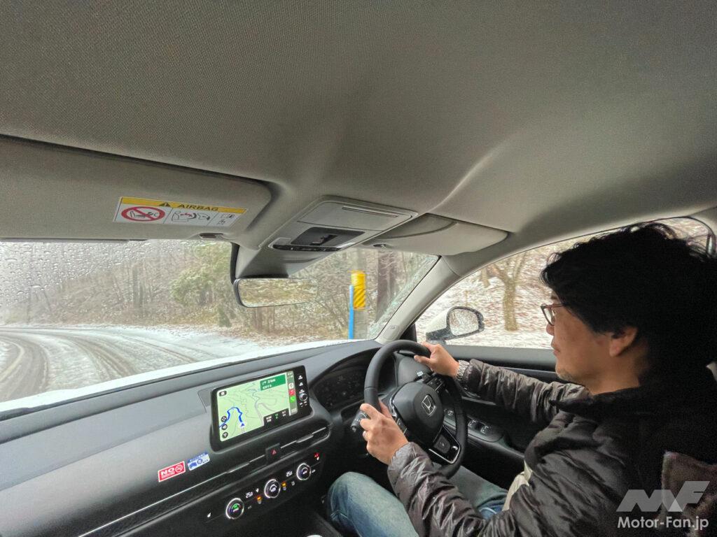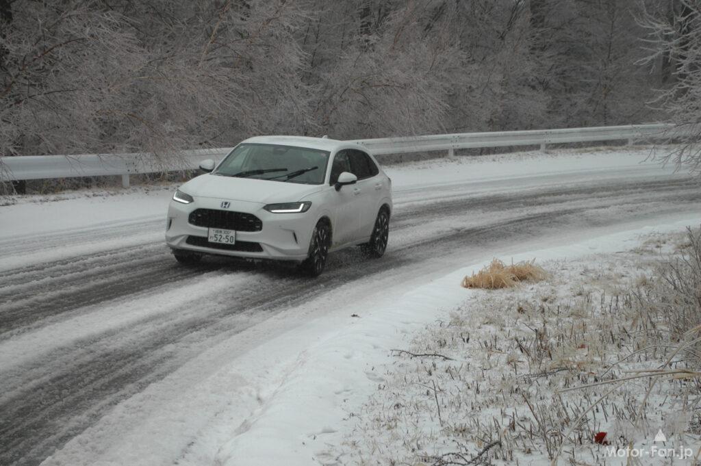 ZRーVのパワーマネージメントはそのほとんどがモーター駆動であることも含めて、滑りながらもトラクションを掛けて行くことが可能であり(VSAはアクティブ。点滅しながらでもアクセルをパーシャルスロットルで維持すれば適切な駆動力をかけ続けてくれる)、慣れてくるほどにジェンスリーSUVの運転しやすさは増して行った。
