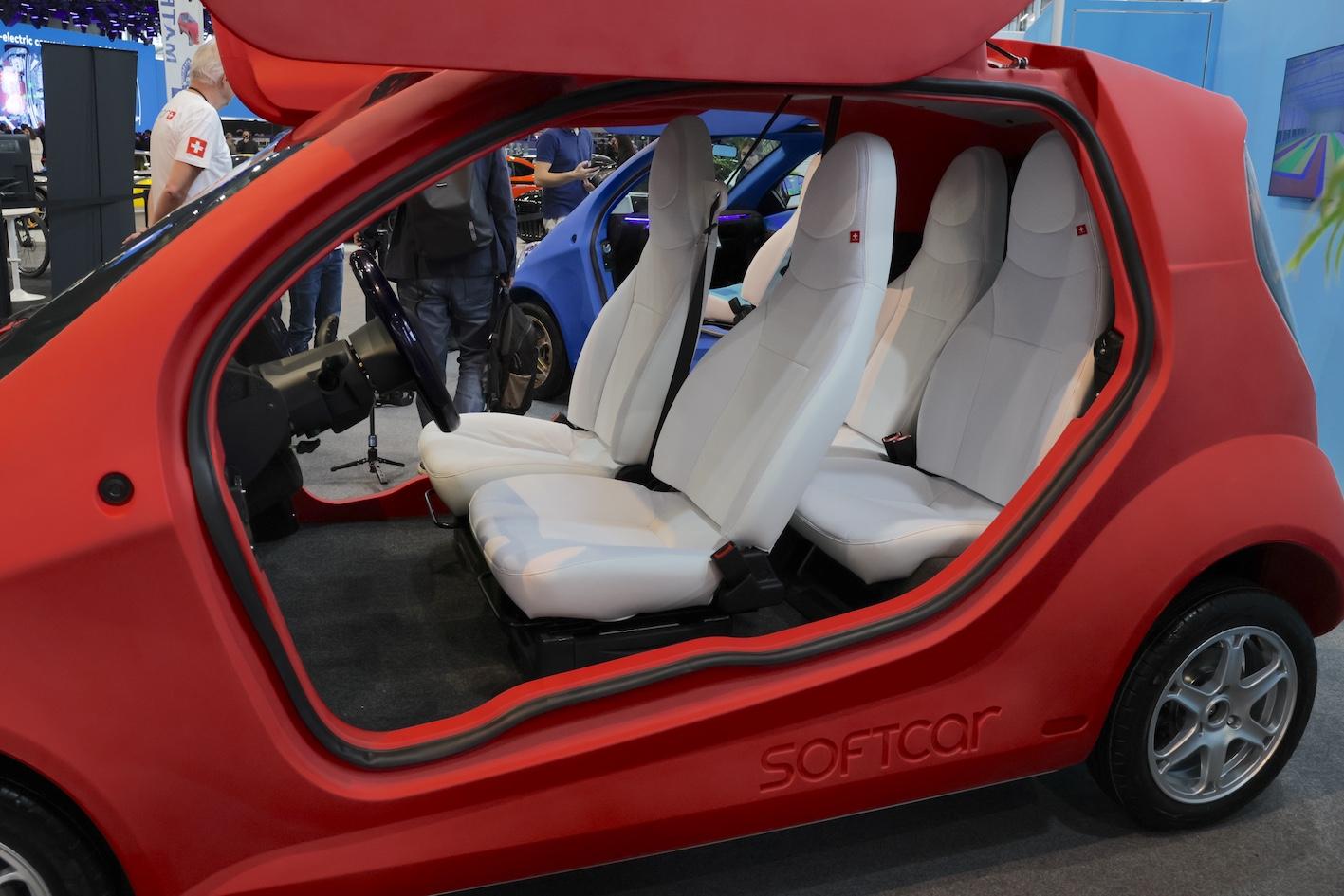 もう1台紹介するのは「ソフトカーSoftcar」です。こちらはスイスを本拠とするエンジニアのジャン=リュック・テュリエーズJean-Luc Thuliez氏率いる同名の研究開発企業による提案です。フラットなEVシャシー上に、樹脂製ボディを載せた4人乗りのシティコミューターです。