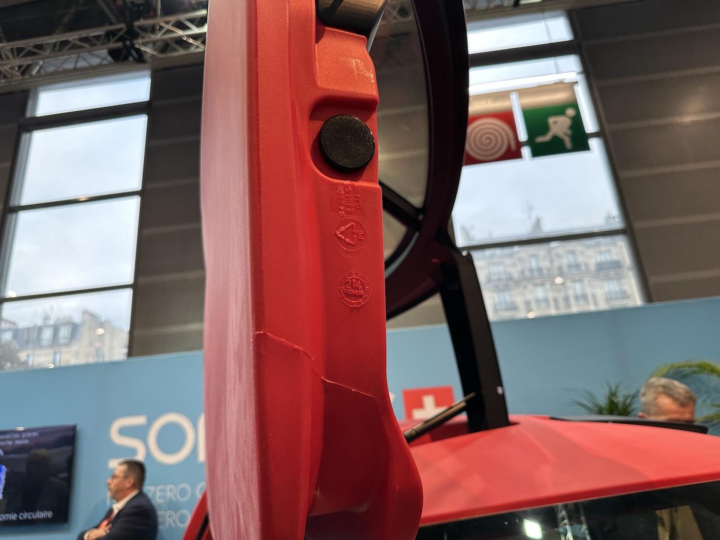 説明によれば、ボディはリサイクル可能なポリマーで成形されており、軽量性、断熱性、衝撃吸収といった利点に加えて、内装まで同じパーツで済ませることができます。ダッシュボードも再生可能な別のポリマーで成形されています。なお、このポリマーに関して、もう少し詳細な情報をビュロン氏に求めたのですが、「まだ機密事項です」との返答でした。