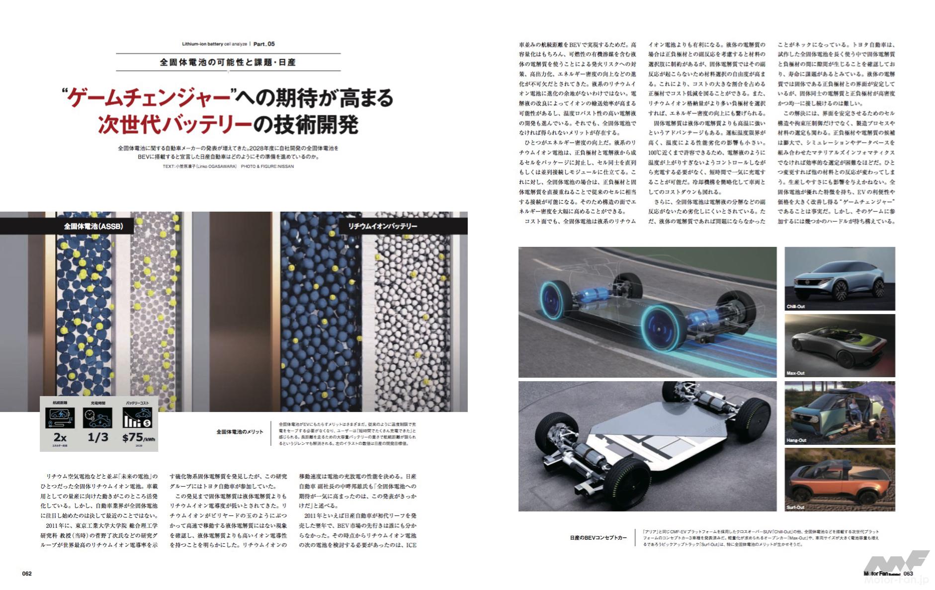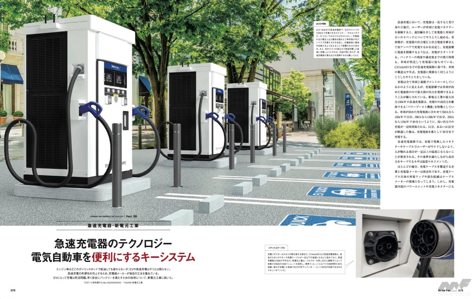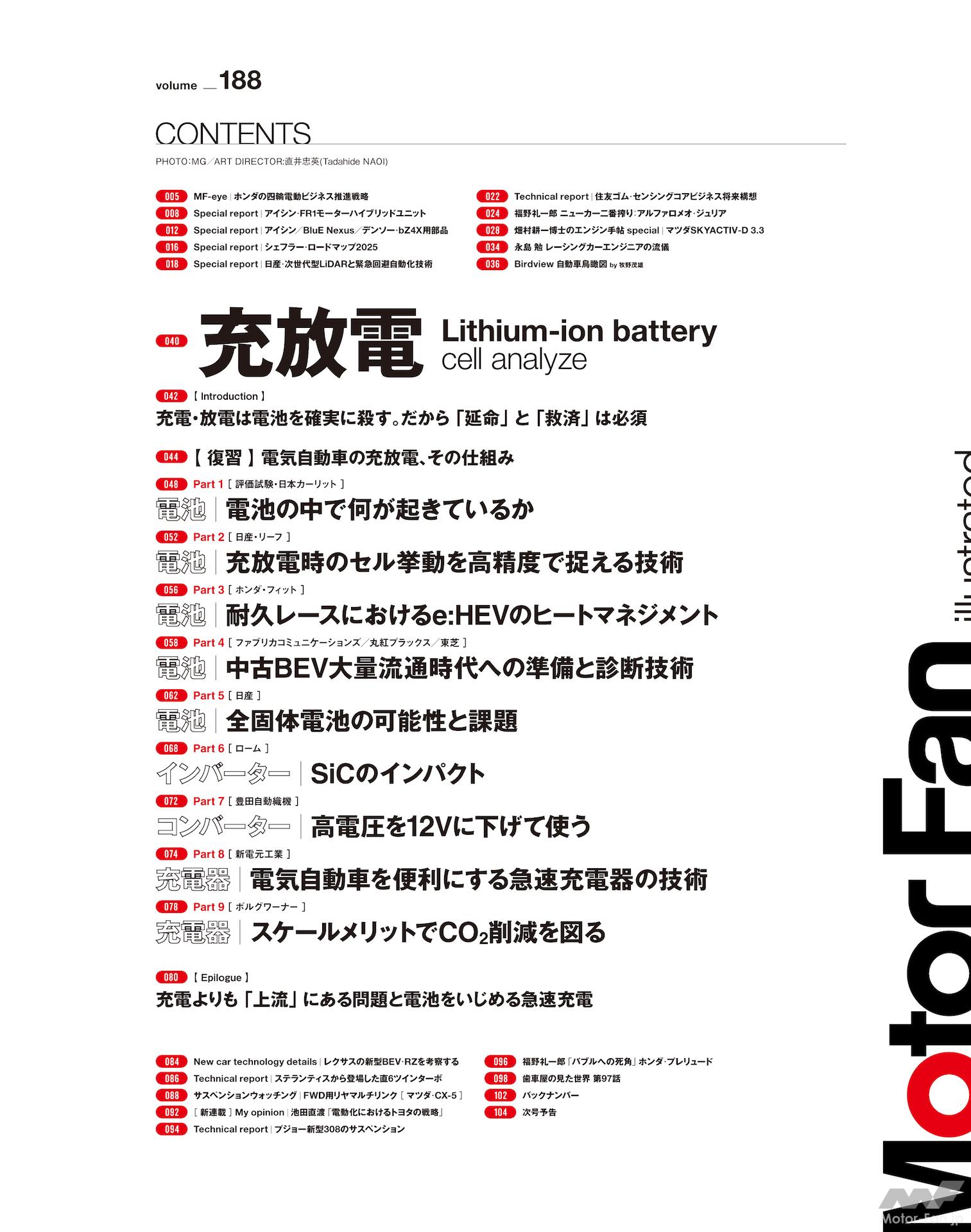 このほかにも、モーターとバッテリーの超有能なコーディネーターともいえるパワーエレクトロニクス、レースシーンにおけるバッテリーのマネジメント技術、将来的に急増する中古BEVに対する評価技術の確立と評価基準の検討など、「充放電」にまつわるさまざまなコンテンツで特集を構成しています。