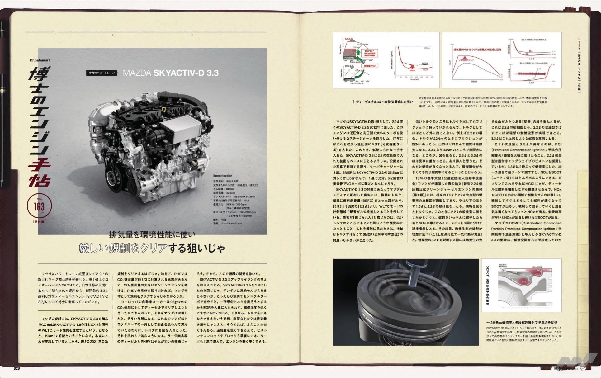 特集外では、好評連載「博士のエンジン手帖」のスペシャル版を展開。先日発表したばかりの話題の直列6気筒ディーゼル:マツダのSKYACTIV-D 3.3について、技術の根幹となるDCPCIとはどのようなものなのか、詳細に検討しました。