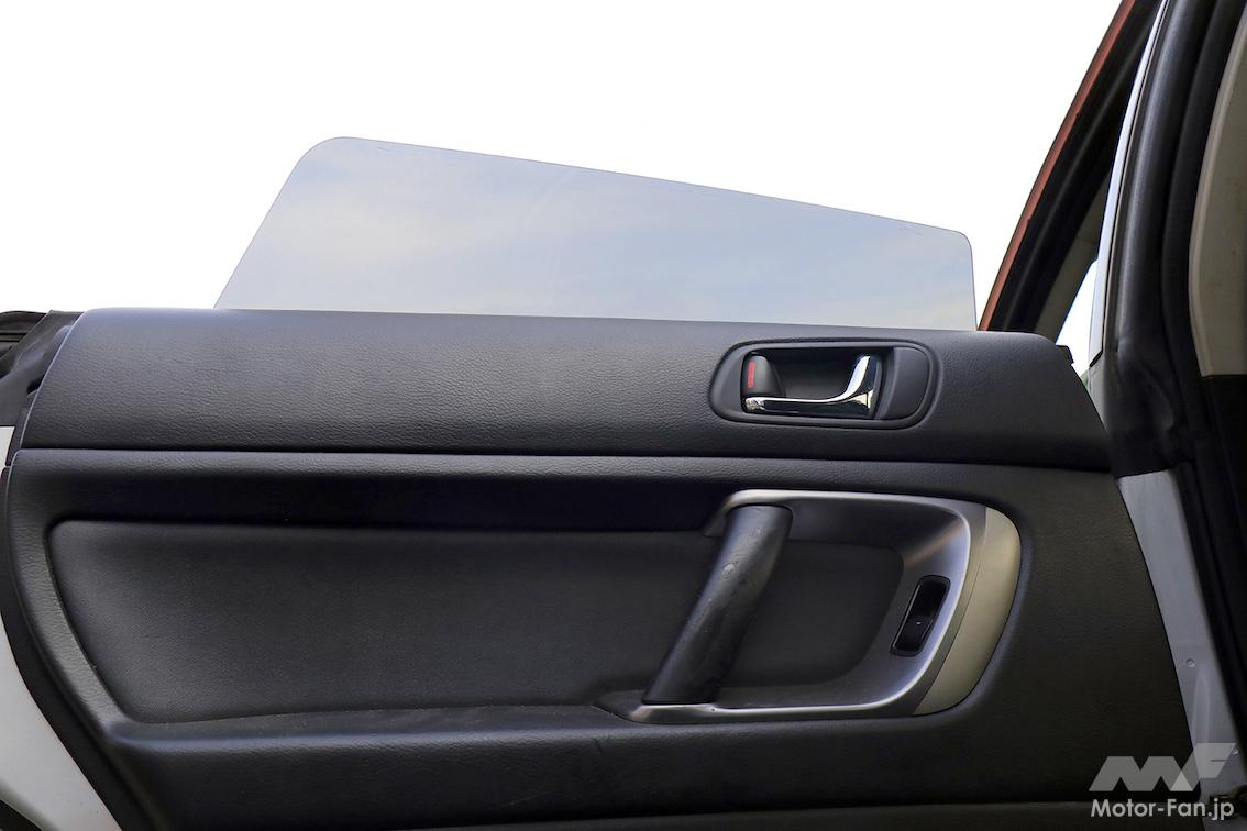 また、欠点も見つけておく。レガシィのサイドウインドウはスタイリッシュなサッシュレス。これは被せてしまう市販の網戸は装着できない。アイデアを出さないといけない。