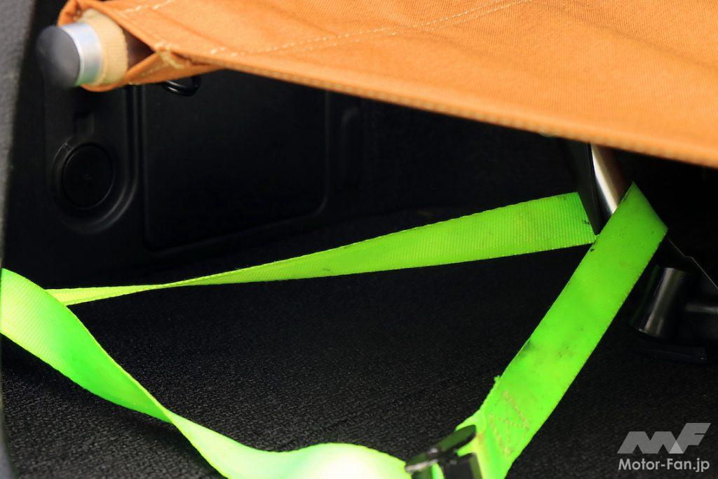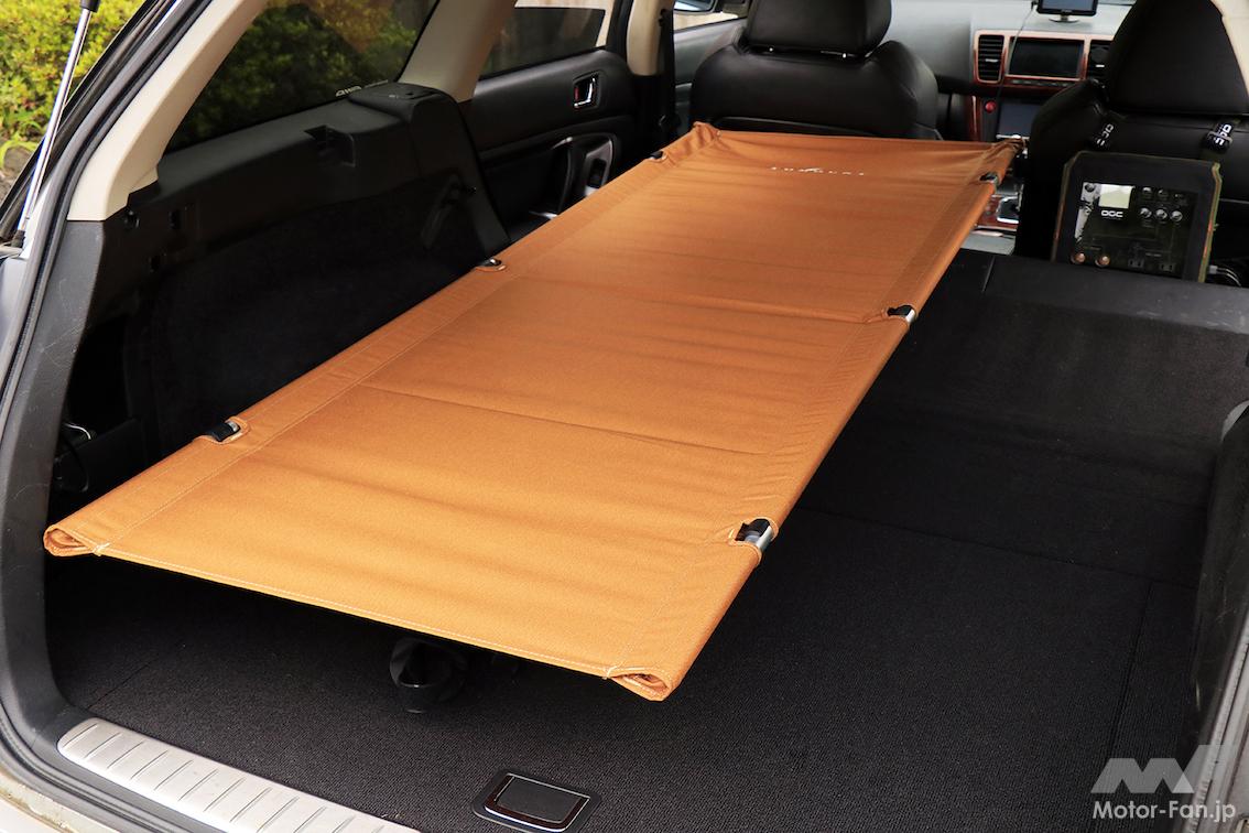 さぁ、寝る場所の確保だ。大の字に寝るのは諦めて、せめて手足が伸ばせるスペースは欲しい。ところが、レガシィは後部座席を倒してもラゲッジの長さは160cmほどである。ワゴンのスペースとしてはじつは優秀なのだが、就寝となるとあと25cmは確保したい。そこで、「合板でフレームを作り、床を延長する」が、頭に浮かぶ。今回それはできない。でもね、ここにキャンピングベッドを入れると、190cmの長さが確保できるはず。長さが190cmのキャンピングベッドでも、支える脚の幅はそれよりも短い。そこで、後部座席を倒した状態でヘッドレストのパイプに角材を渡してインシュロックで固定してやる。そこにキャンピングベッドの脚を固定すればいいわけだ。角材を高さに合わせて削り込んでやればいいのだが、キャンピングベッドはアルミのパイプなので、少しくらいはしなやかに曲がって対応してくれるはず。横になって寝心地が良ければそれでいいのだ。
