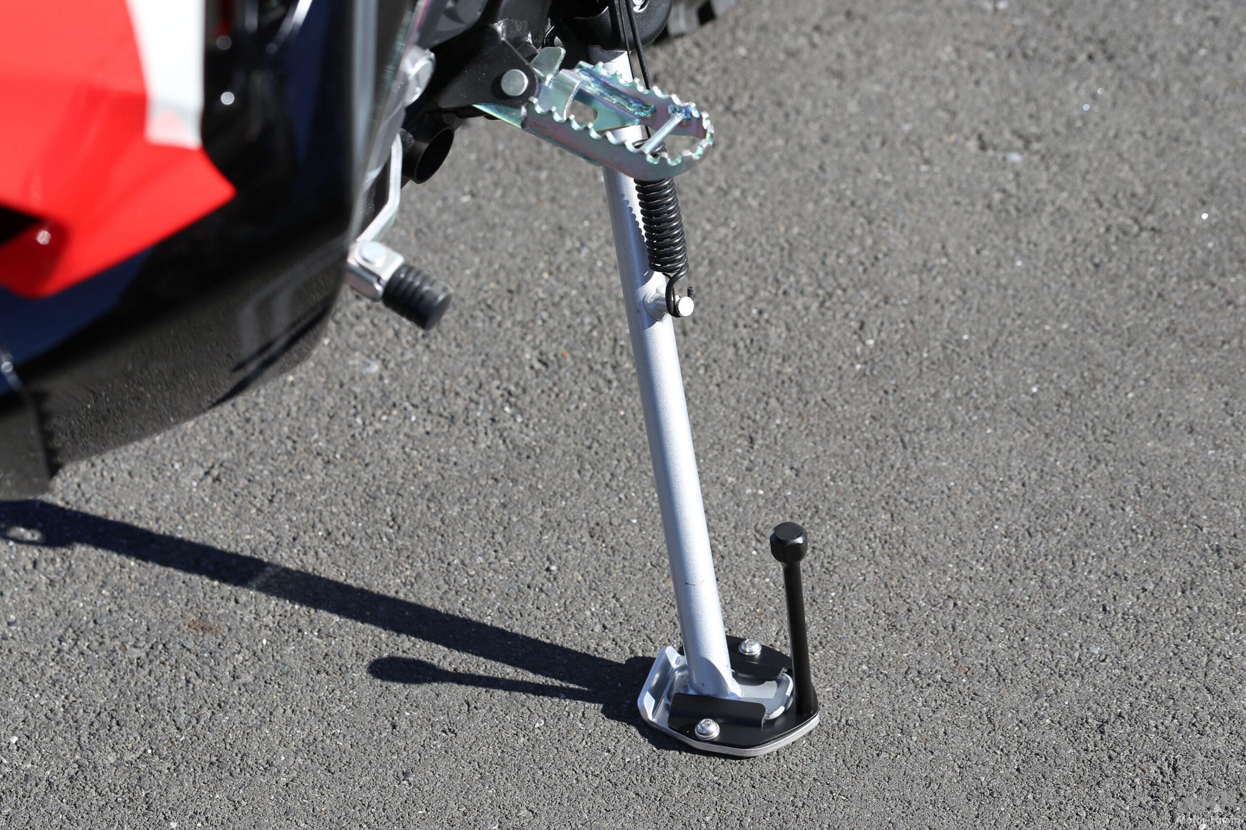純正比で接地面積が約2.9倍に広くなるので安定して停められます。オフ車は林道などの荒地を走る機会も多いからぜひチェックしておきたいところです。