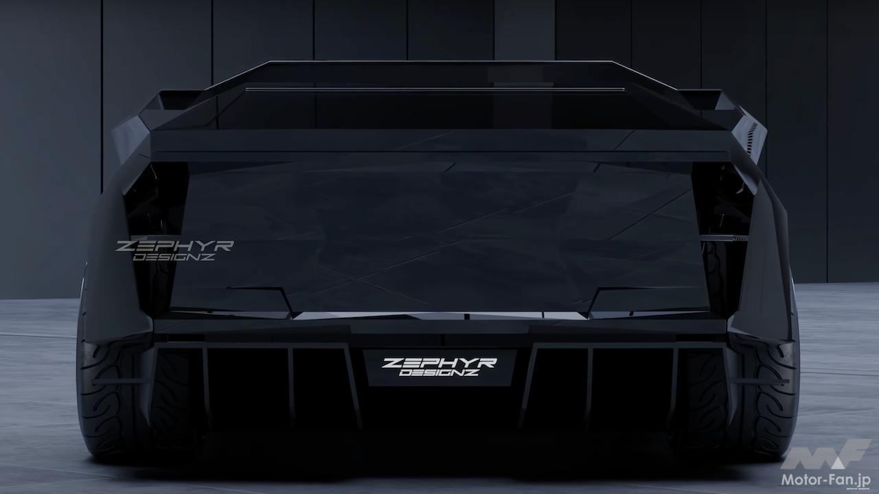 ポルシェの水平対向6気筒エンジンを後部に乗せ、ボディをローダウン、奇抜なボディキット、赤いブレーキキャリパーを備えた特大ホイールを装着した。BEV の角張ったデザイン言語を反映しているが、トラックのレーシング バージョンに似たレンダリングが実現しているといっていいだろう。