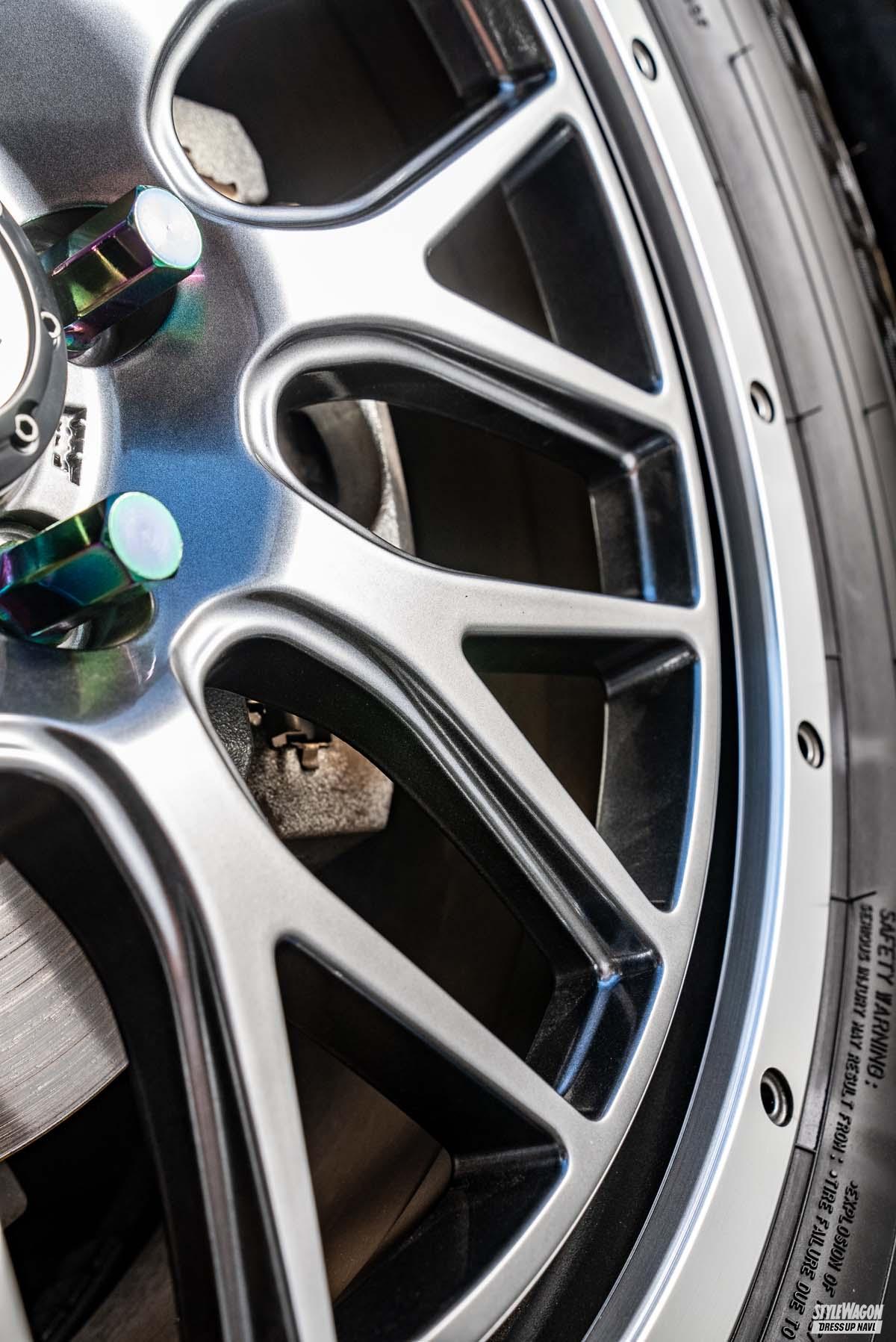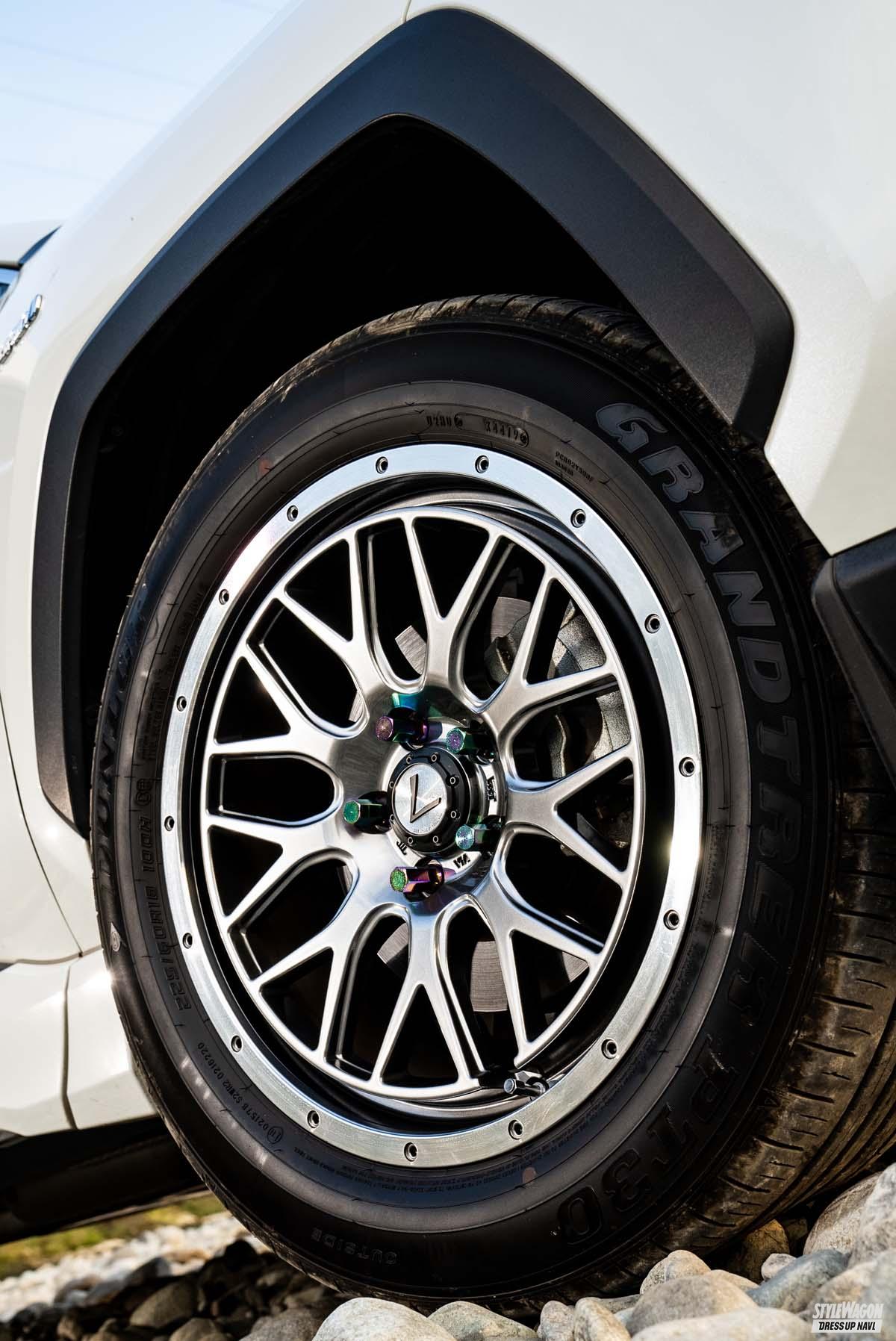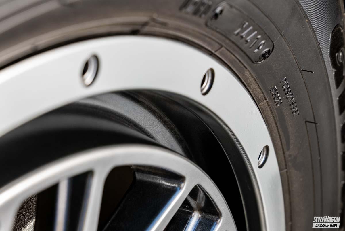 リムフランジにはオフロード系の定番、ビードロックスタイルを踏襲。ワイルドさをダイレクトに演出しつつ、ダイヤカット仕上げで高輝度をプラスするなど、街中の華やかな景色にもなじむスマートさも与えられる。