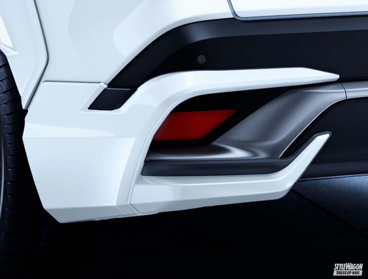 サイドスカートも同色化して、立体感のあるサイドビューを構築している。また、前後のカラードフェンダーは迫力度満点。リアは両サイドのスパッツがリフレクターを囲むように「コ」の字型を描いている。