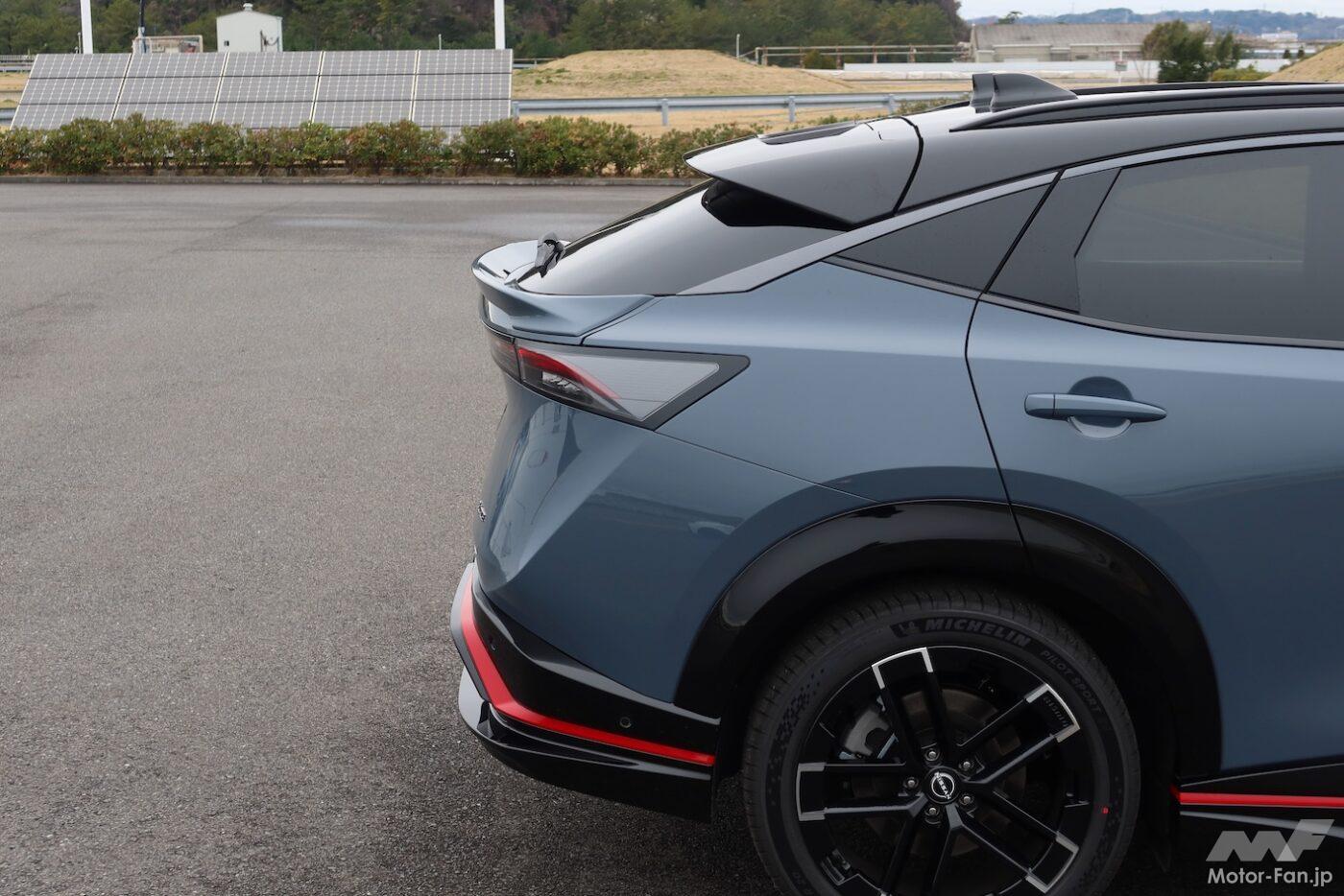 リヤはバンパー底面のディフュザー部を40mm延長したのに加え、ダックテール状のスポイラーを追加。ルーフスポイラーの形状を最適化することにより、渦が発生するポイントが後ろになりドラッグ(空気抵抗)が低減する。アリアNISMOはこれら各部の形状最適化により、ベース車に対してリフトを40%、ドラッグを6%低減した。