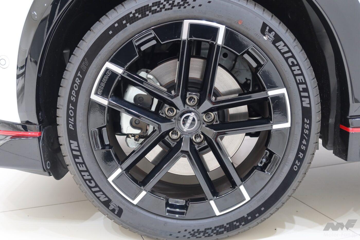 タイヤは専用開発のミシュラン・パイロット・スポーツEV(255/45R20)を装着。コンパウンドや内部構造は専用にチューニングした。背反関係にあるグリップと転がり抵抗の両立に取り組んだという。また、高い静粛性を実現するため、特殊吸音スポンジを採用した。
