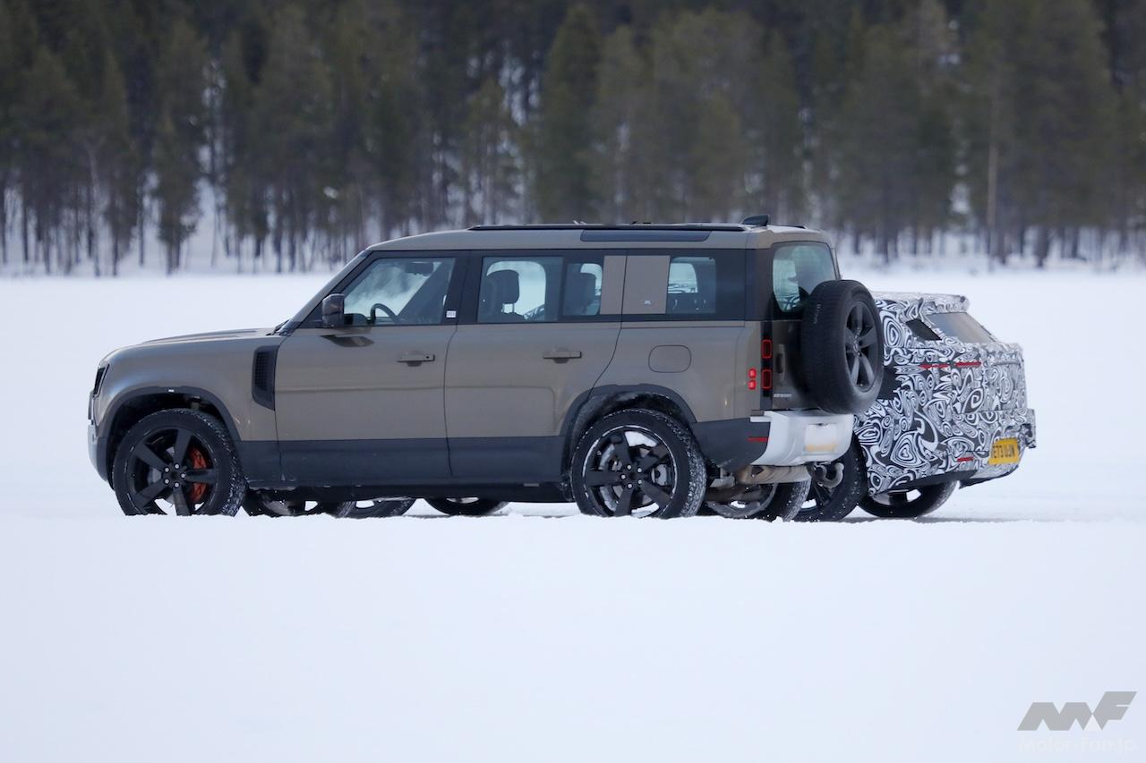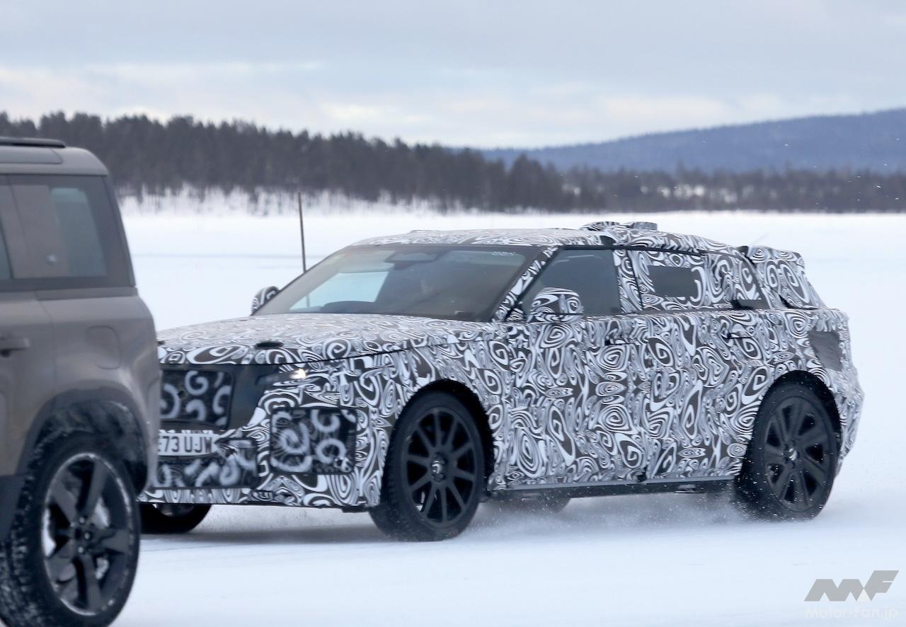 凍てつくフィンランド・ラップランドで捉えたプロトタイプは、厳重なカモフラージュで隠されている。洗練されたシルエットが見てとれるが、低床設計はオフロード性能よりも、高速道路の性能に焦点を当てている可能性がある。言い換えると、背が高く箱型でオフロード志向のデザインを維持すると予想される、フラッグシップのレンジローバーではない可能性を示唆している。代わりに、レンジローバー ヴェラール後継モデルであると推測されるが、EV版が同じ車名を維持するかどうかは不明だ。