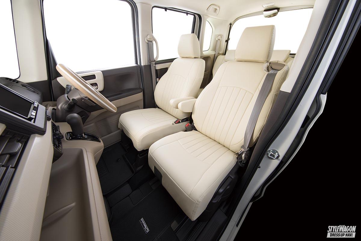 シンプルなデザインと質感の高いレザーとの組み合わせで生まれた、純正感覚の高級感を生み出すシートカバー。●価格▪1万9800円〜5万2800円●カラー・種類▪ブラック、グレーなど全5色●対応▪ミニバン、SUV、Kカー多数●ギャルソン事業部 072-952-0567 https://www.garson.co.jp