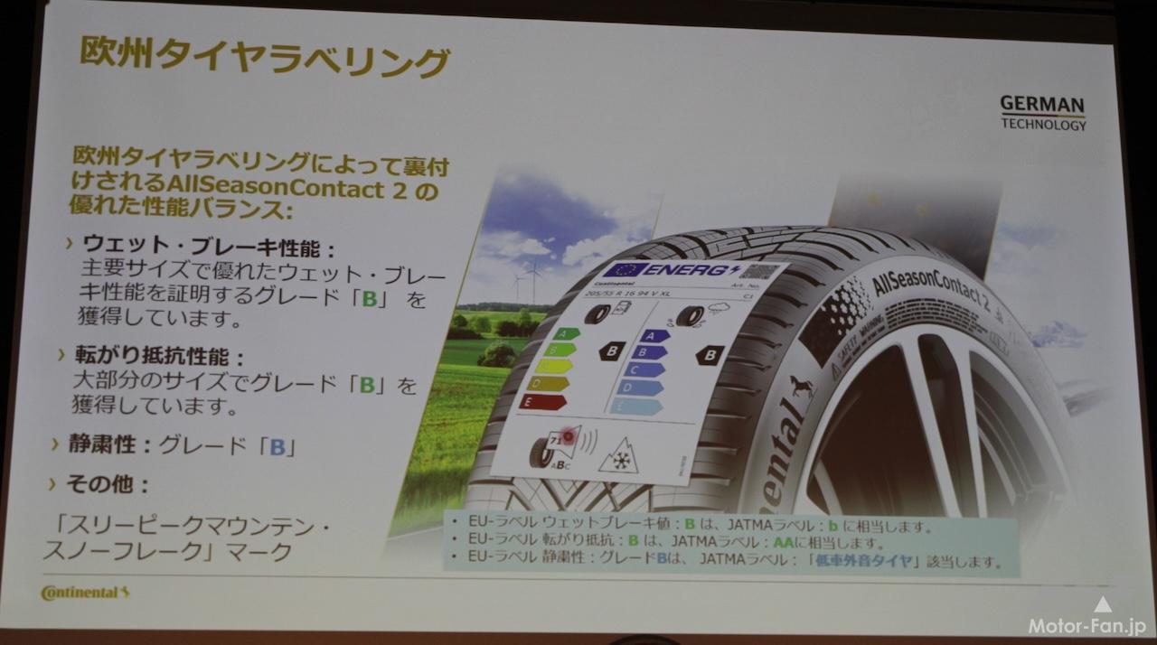 安全性や夏タイヤから冬タイヤの履き替え(その逆も含む)という手間からの解放、環境への配慮、タイヤ&アルミホイールのセットで済むコスト面の利点など、ユーザーがそれぞれ求めるニーズに応えるため、性能面で全方位バランスに優れた「AllSeasonContact 2」を送り出したとプレゼンした。