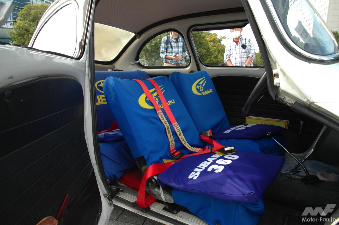室内に目をやると、スバルワールドラリーチームカラーのシートカバーや、スバル360車名入りクッションなどが鮮やかに目に映る。また、ステアリングも当時の細いステアリングホイールのものではなく、ダートトライアル時代に使用していたインターゲット製をR2/レックス用のステアリングボスを介して装着。ホーンボタンはSTIロゴのものをセレクト。