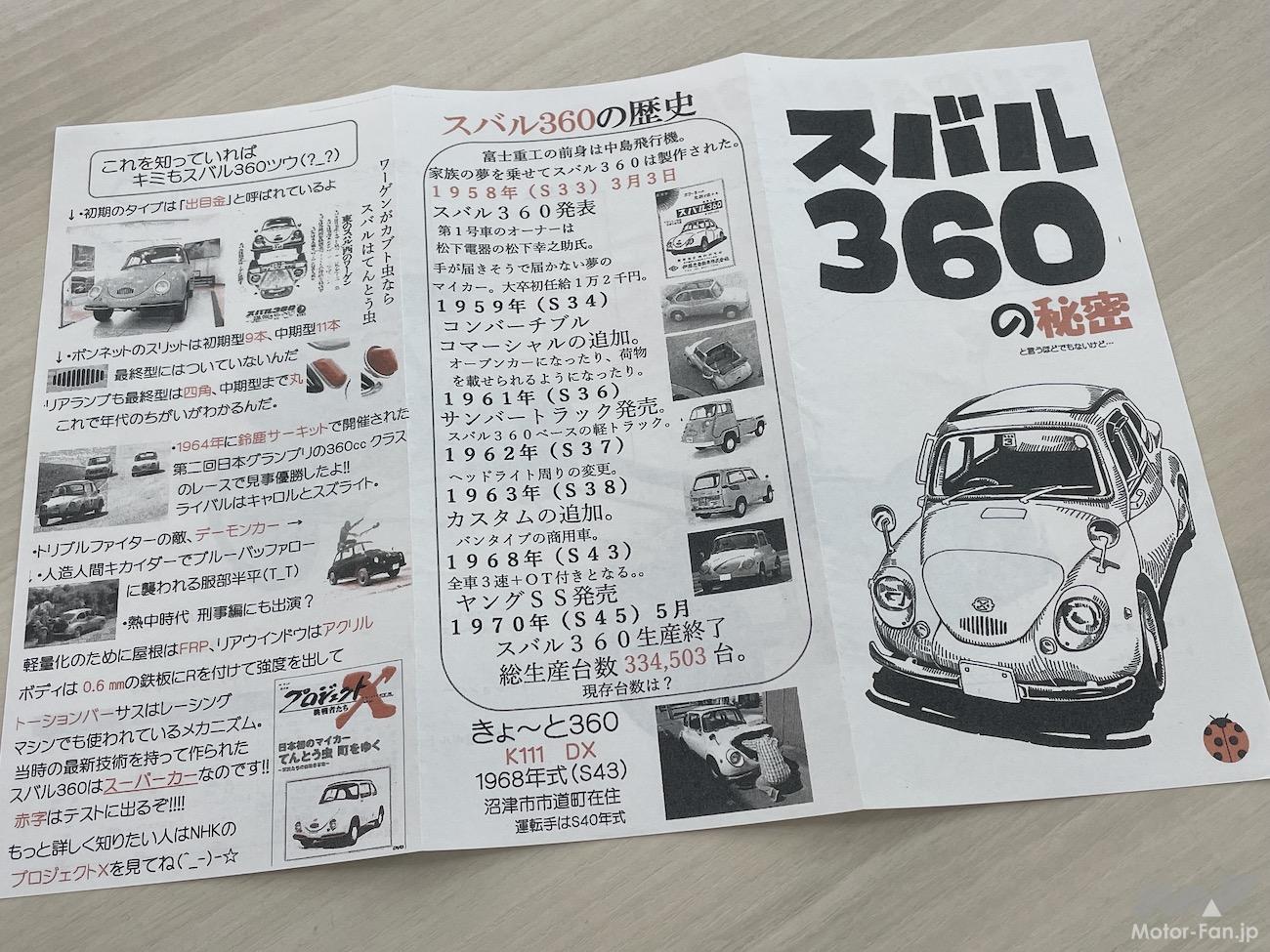 きょ〜と360さんはイベントに参加する際など、こうした愛車のカスタムポイントをスバル360の豆知識として紹介するリーフレットを配布していたりするという。
