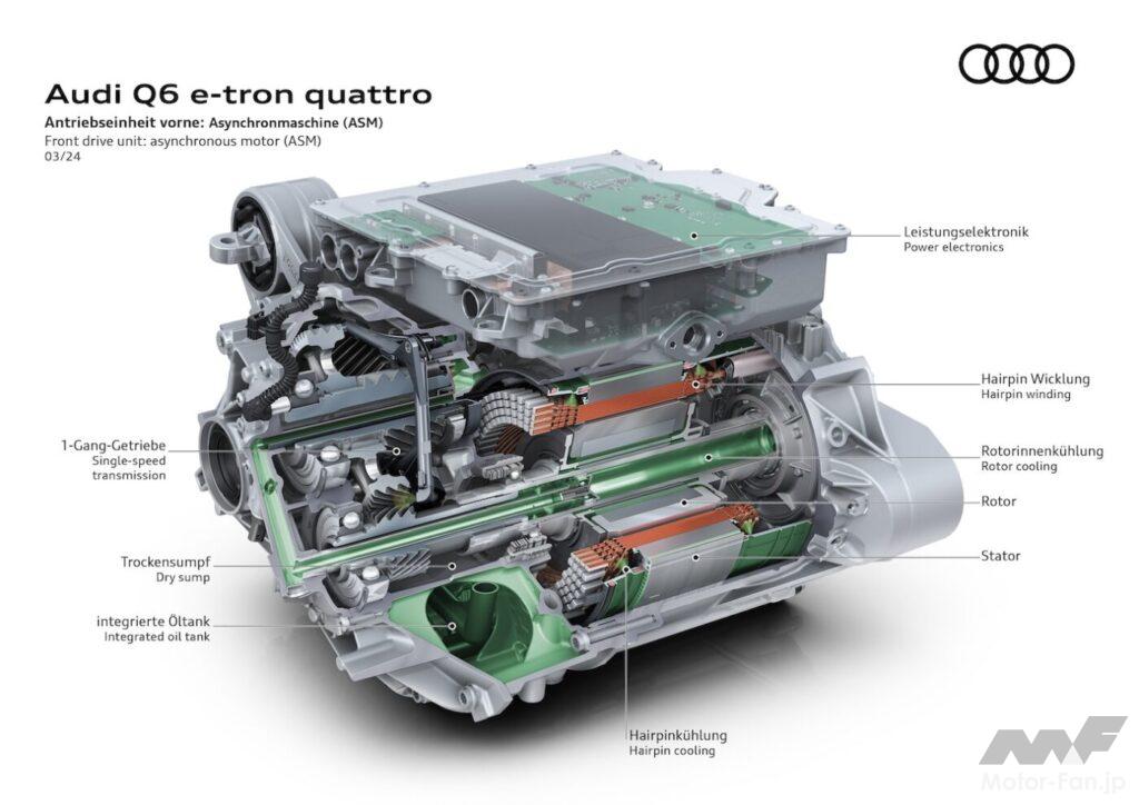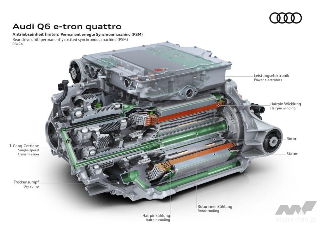 搭載するモーターはリヤがPSM(永久磁石同期モーター)、フロントがASM(非同期モーター)となる。モーターはアウディのハンガリー・ジェール(Gyor)工場で生産される。新開発のモーターは出力・NVH性能も含めて大きく進化している。