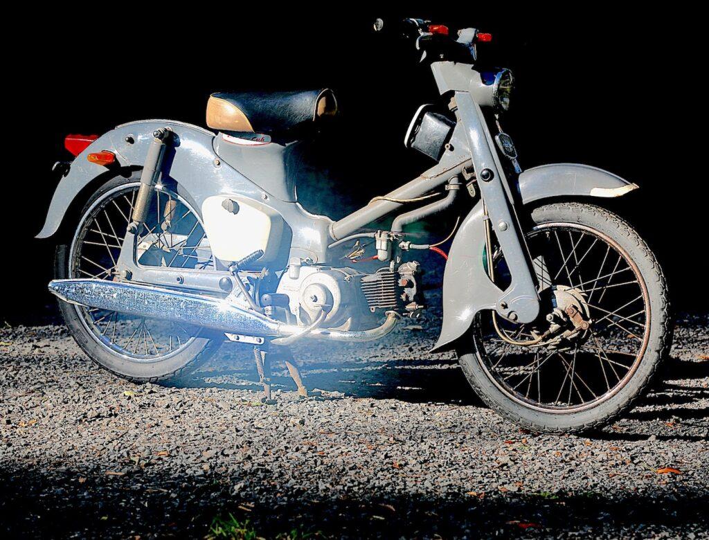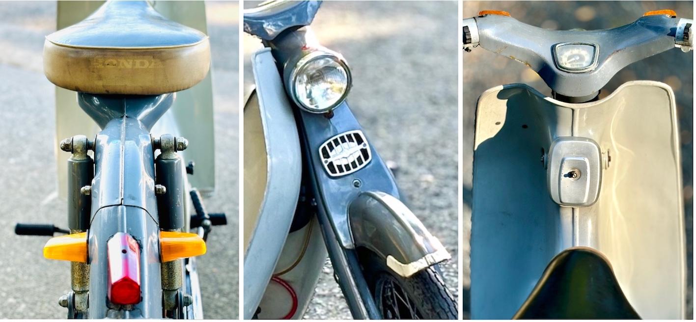 そして多くの若者たちは実用車のシンボルのレッグシールドを外しました。すると一気にバイクっぽくなりバイク乗りを気取りバイクの世界に入ったのです。それは優れた機能的レイアウトのなせる技の二面性です。レッグシールドを外すと空気と燃料で内燃機関が動く2輪車の構造の教科書が現れ感銘します。