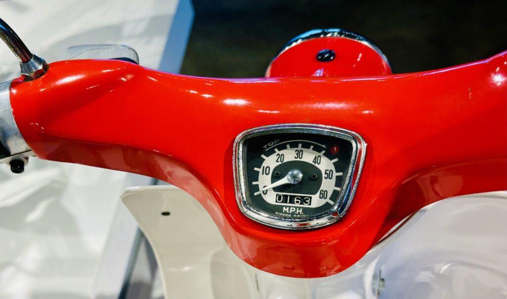 小さなヘッドライトは車体のコンパクトさを象徴し愛らしく、通称カモメタイプのハンドルカバーは最もデザインでカブを主張しかつユーザーフレンドリーさを演出してます。フォーンのレイアウトもデザインのアクセントです。