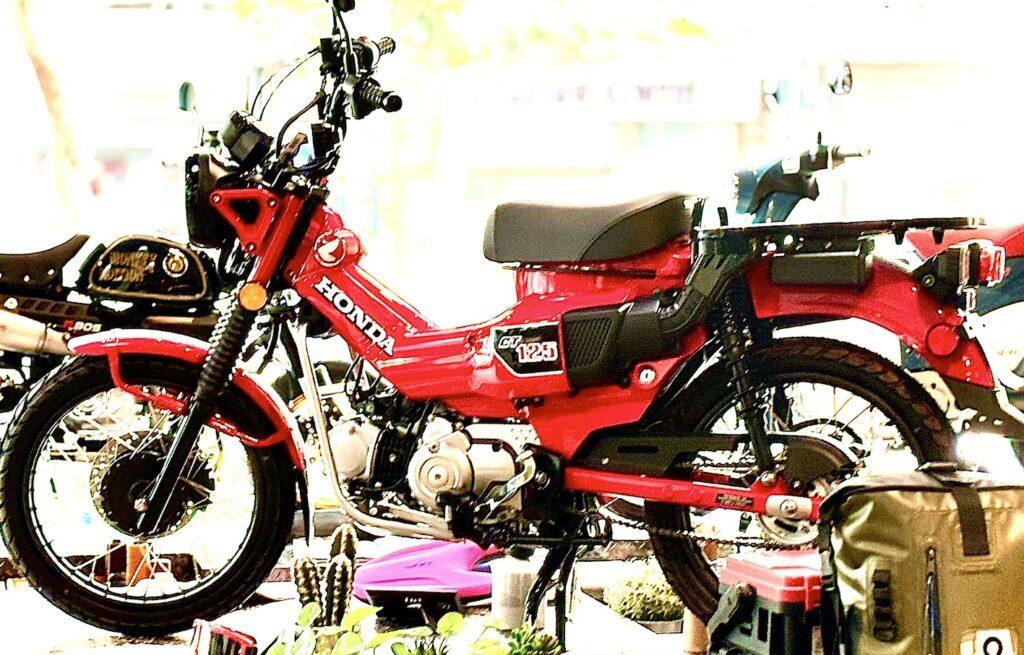 また巧みな構成から生み出したアウトドアイメージのハンターカブもアメリカ人の心を掴みました。週末には家族でアウトドアを2輪で楽しむ文化が芽生え。その後のオフロードの大ブームのきっかけになったのです。キャンピングカーの後ろに積まれるのもハンターカブが定番でした。