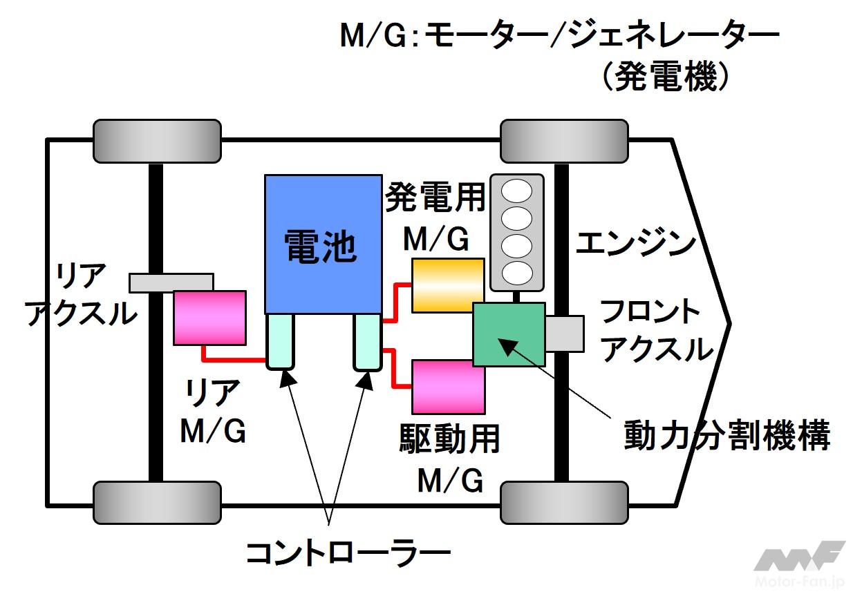 ハリアーで採用された電動4WDの“E-Four”は、2001年に「エスティマ・ハイブリッド」で初めて搭載された。通常のハイブリッドの前輪を駆動するエンジンとモーター/ジェネレーター(M/G)に加えて、後輪もM/Gで駆動する電動4WDである。