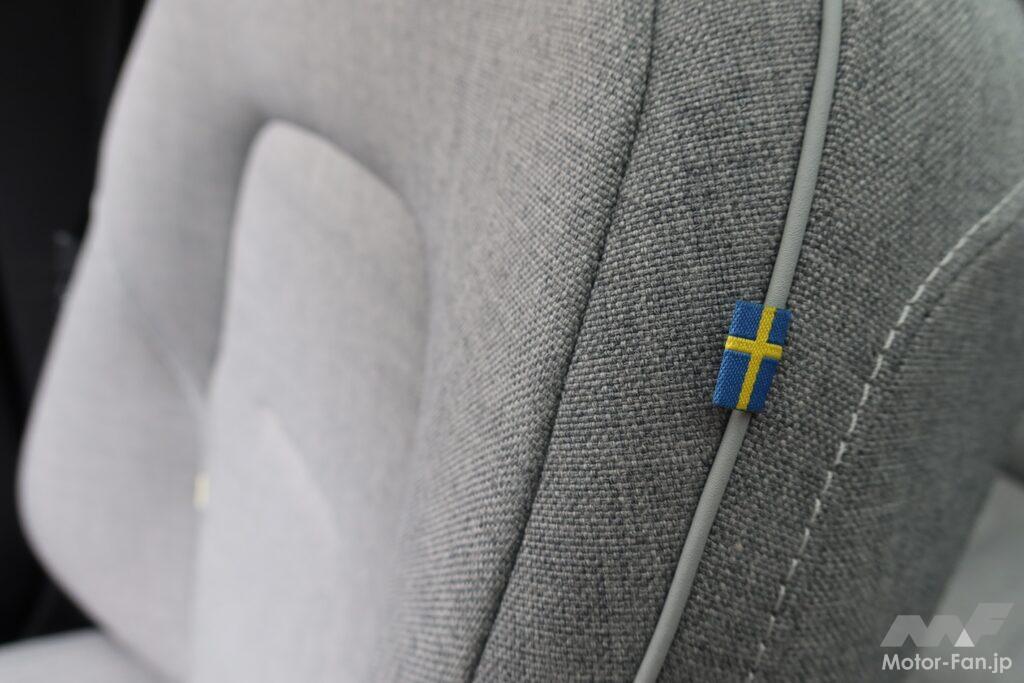 インテリアはサステナブル素材のオンパレードだ。試乗車のミスト・インテリア(他にブリーズ・インテリアがある)は、シートに「責任を持って生産されたウール30%とリサイクルポリエステル70%を使用したテイラード・ウールブレンド」を使用。助手席には小さなウールマークが付いているし、運転席には対をなすようにスウェーデンの国旗が縫い付けられており、「こういうセンスがいいんだよね」と思わず頬が緩んでしまう。