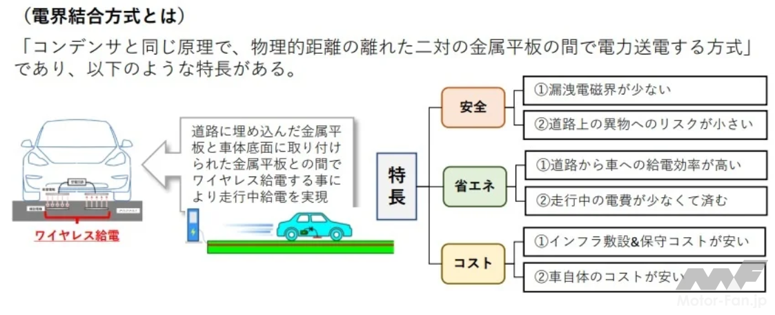 EVのワイヤレス走行中給電は、バッテリーEV車や燃料電池車と比べて、『利便性』『安全性』『環境性』に優れており、次世代交通網の決定版である。そのなかでも「電界結合方式のワイヤレス給電」は、EV走行中給電に最も適した方式である。