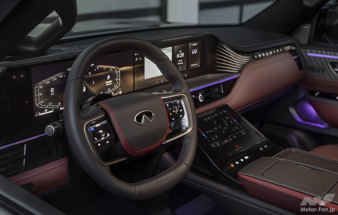 インテリアは、ダッシュボード上に14.3インチのディスプレイを2基搭載。最新の「INFINITI in Touch」システムにはGoogle built-inを搭載し、Google MapやGoogle Play、Google Assistantなどを利用することが可能となり、より快適なドライブ空間を演出する。センターディスプレイの下部にある9インチのタッチスクリーンでは、空調機能や運転モードの選択が可能だ。
