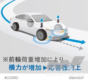 また、新型アコードには「モーションマネジメントシステム」と呼ばれる、ピッチモーション制御も搭載されている。これはステアリング操作に応じて、前輪荷重を最適化するようコントロールするというもの。ワインディング試乗では、ボディサイズを感じさせないスッとノーズが入っていく様を確認できた。