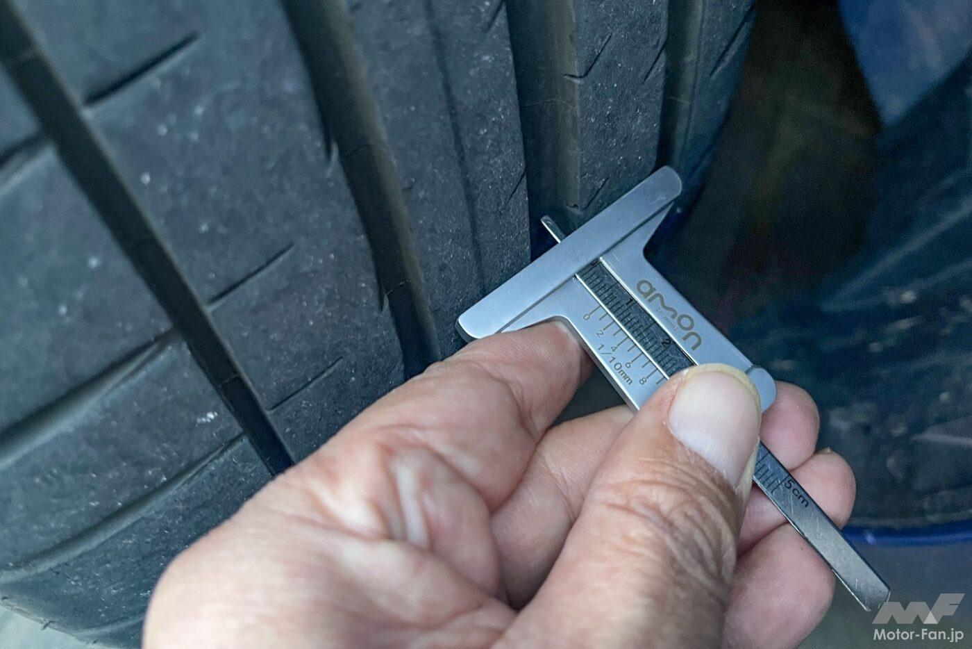 ミシュランタイヤのスリップサインが出る深さは法規に適合した1.6mm。現在の6.5mmから4.9mm減った数値だが、この調子でいくとあと70000kmも走れる計算になる。しかも納車時から8年もかからないので、ミシュランが推奨している交換時期10年にも満たない。