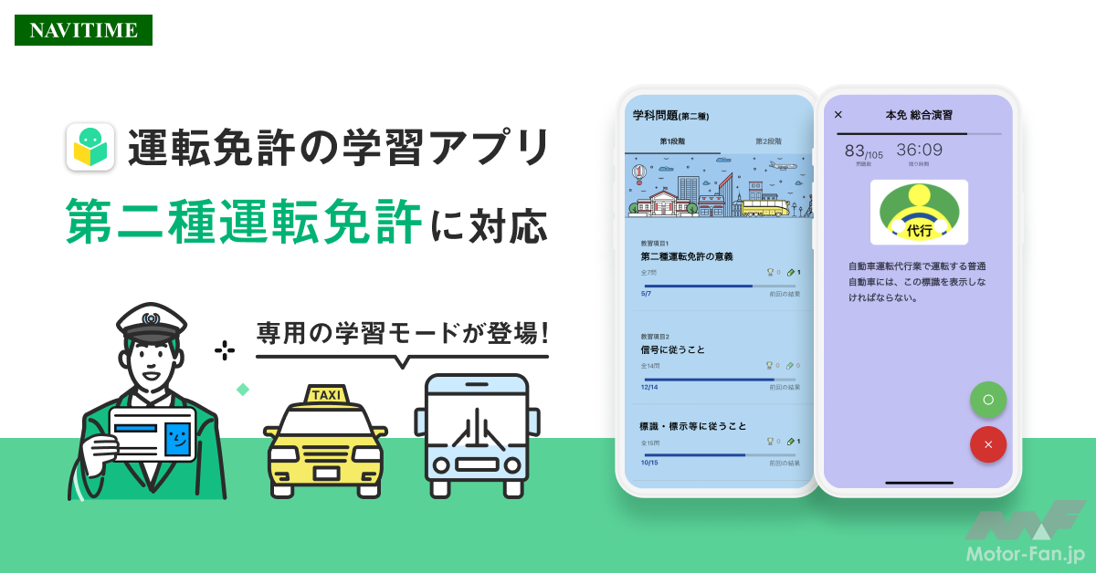 『運転免許の学習アプリ』は、カーナビタイムやナビタイムドライブサポーターなどのスマホ向けカーナビアプリを展開するナビタイムジャパンがリリース。3月22日のバージョンアップでは新たに“第二種運転免許”に対応した。