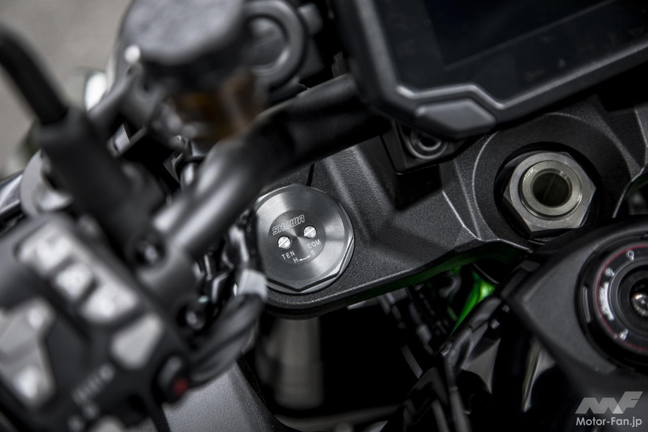 もうひとつ興味深いのは、基本的に共通エンジンを搭載するH2 SXと比較すると最大トルクの発生回転数はH2 SXの9,500rpmに対して、Z H2は8,500rpmに低くなっている事。さらにドリブンスプロケットが2丁大きな46丁を装備して二次減速比がH2 SXの2.444からZ H2では2.555へと低められていた。吸排気系とバルブタイミングはオリジナル設定だ。