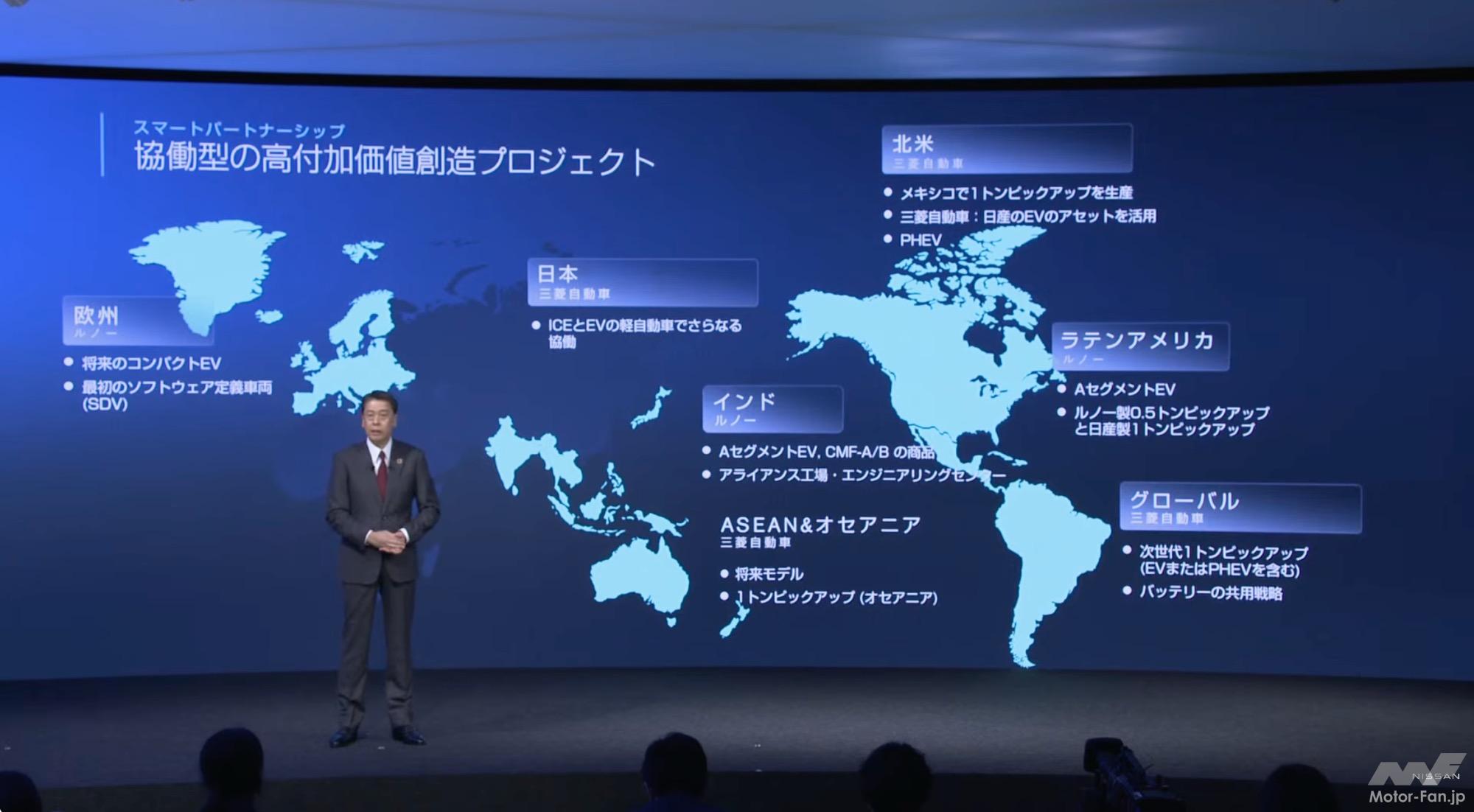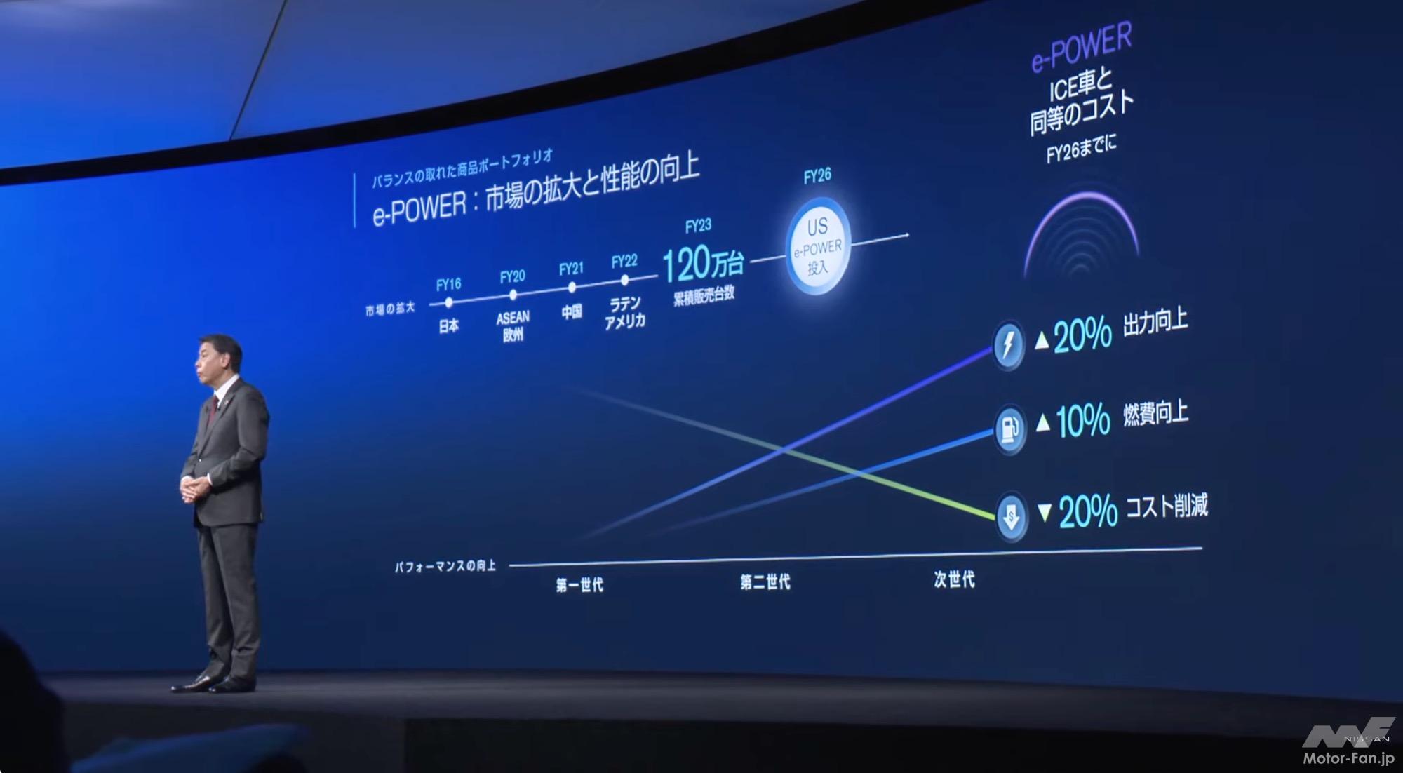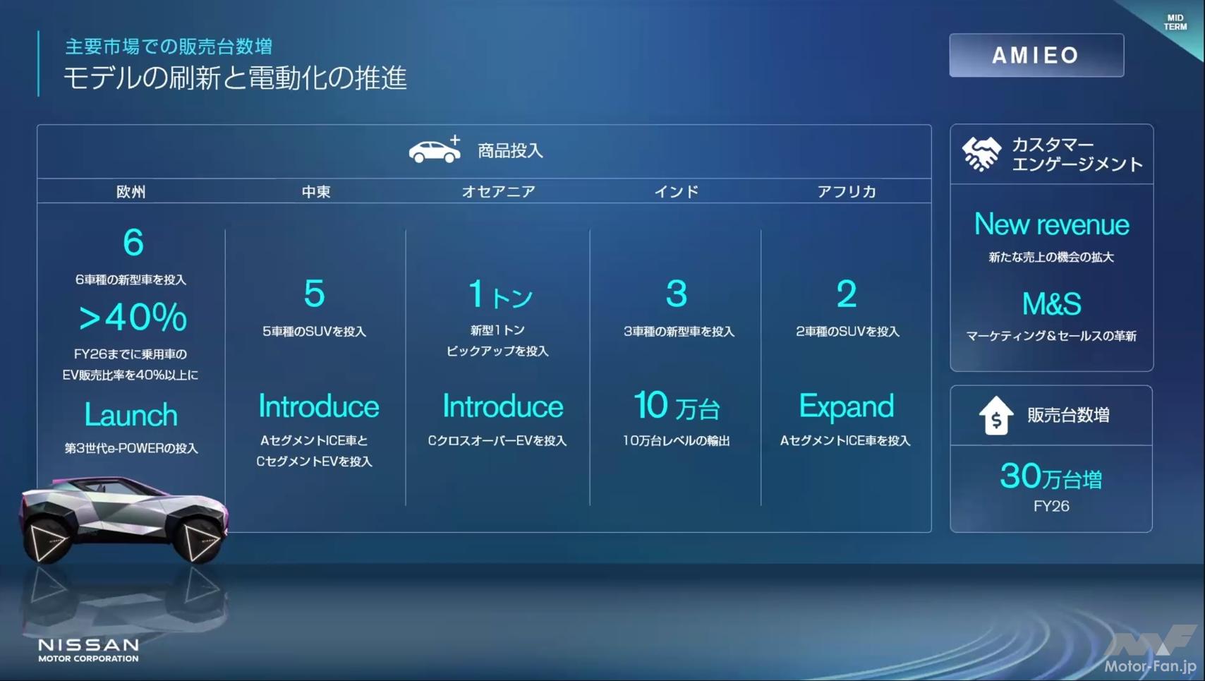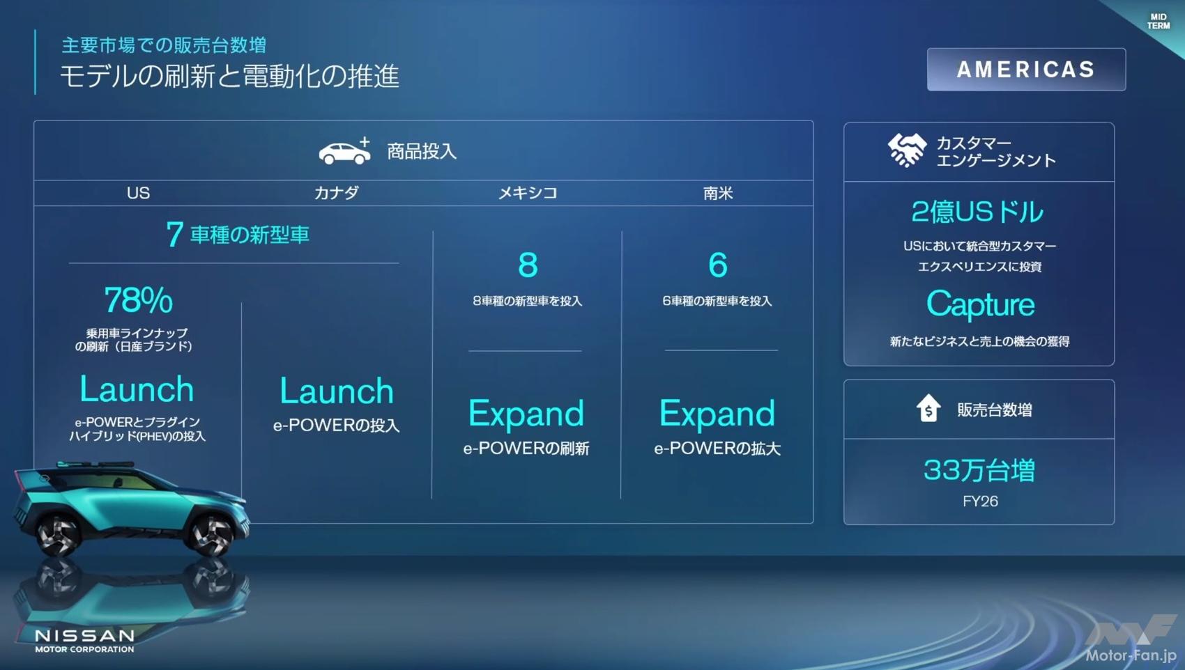 アメリカズ市場では、地域全体の販売台数を2023年度比で33万台増加させることを目指す。米国では、統合型カスタマーエクスペリエンスに2億米ドルを投資し、7車種の新型車を投入。さらに、米国では乗用車モデルラインアップの78%を刷新し、e-POWERとプラグインハイブリッドを搭載したモデルを投入する計画としている。