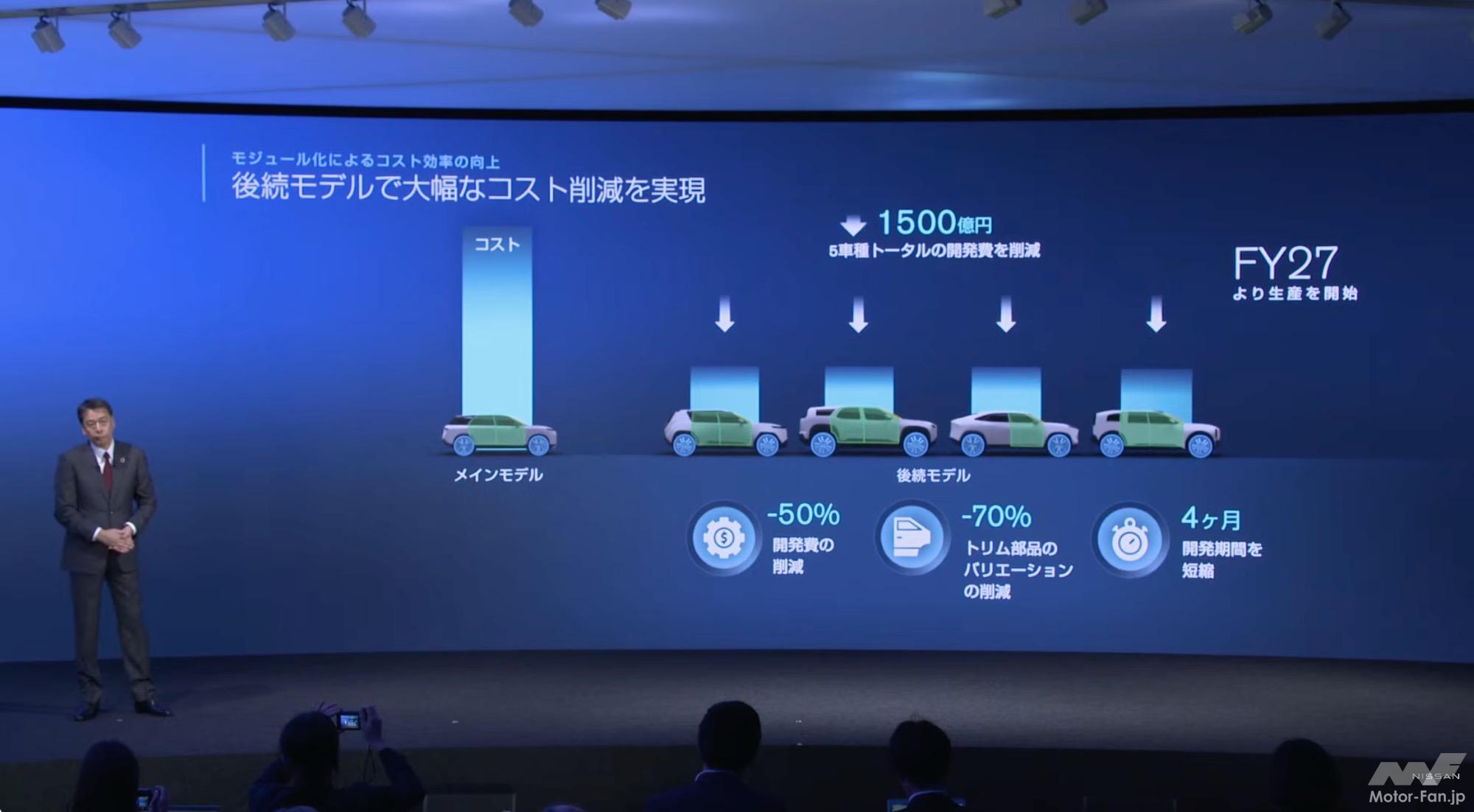 具体的な取り組みとして、次世代EV開発では複数のEVを共通設計として、プラットフォームやアッパーボディを共通化したファミリー開発により、開発コストを大幅に削減する計画だという。同コンセプトで開発した5つの異なるモデルのEVは2027年度より生産開始される予定だ。