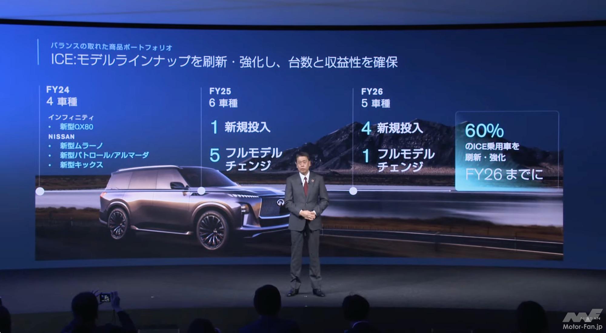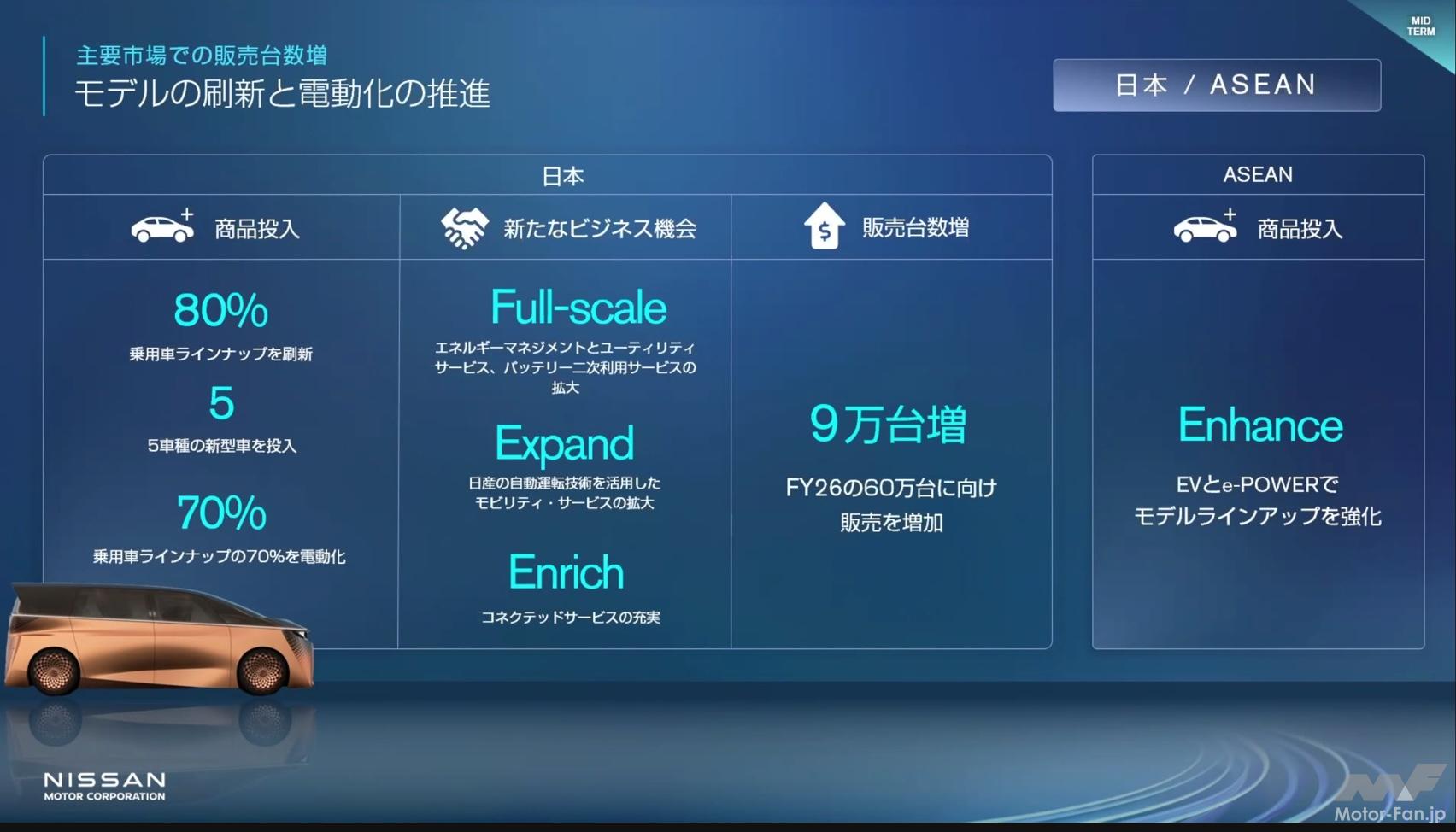 日本市場では、乗用車モデルラインアップの80%を刷新し、5車種の新型車を投入予定。電動車のモデルミックスを70%へ向上させ、販売台数を2023年度比で9万台増加させ、2026年度に年間60万台の販売を目標としている。