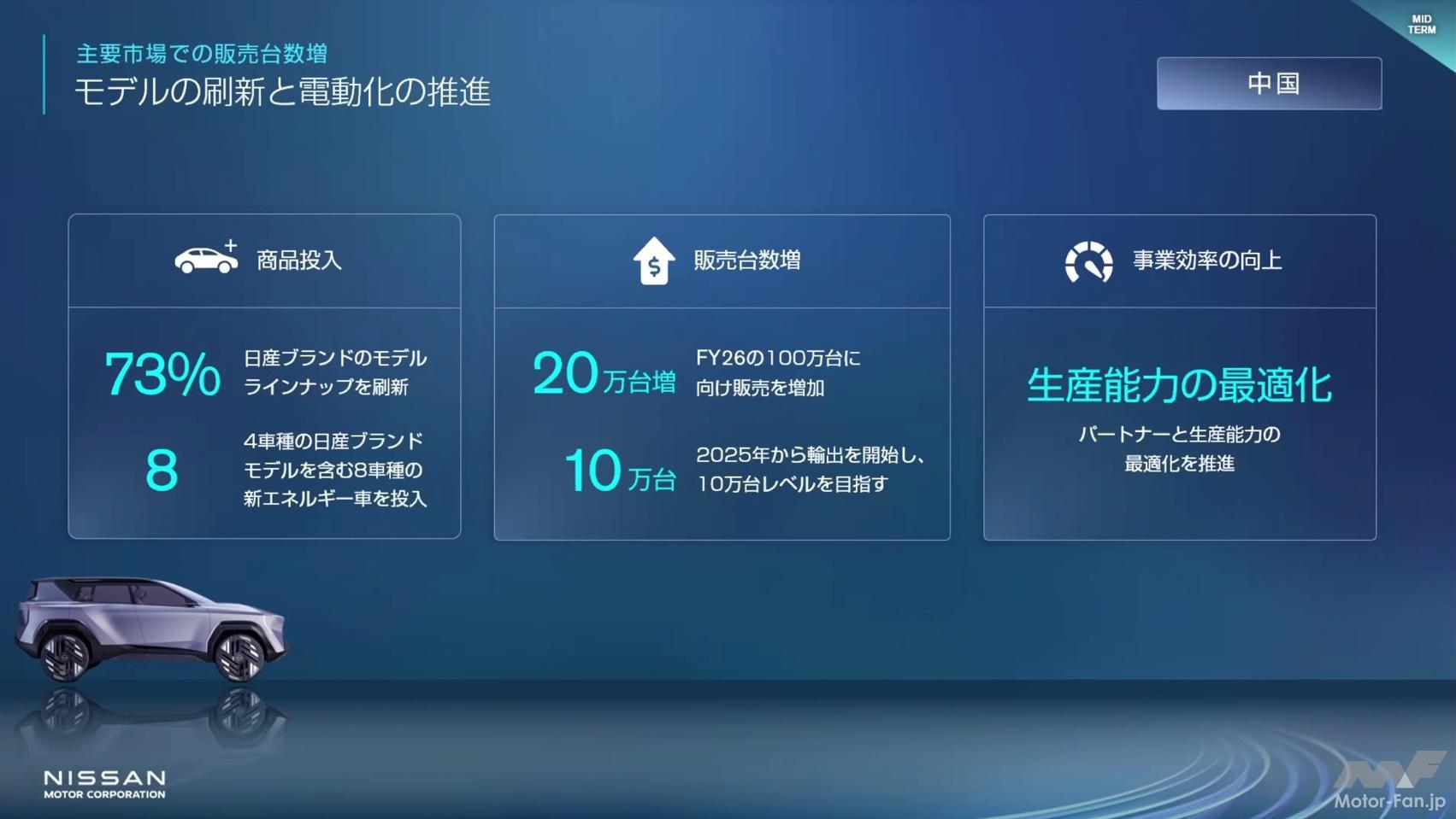 中国市場では、日産ブランド車のラインナップの73%を刷新し、新エネルギー車(NEV)8車種を投入します。販売台数を20万台増加させ、2026年に年間販売台数100万台を目指す。さらに、2025年から輸出を開始し、第一段階として10万台レベルを目標としている。