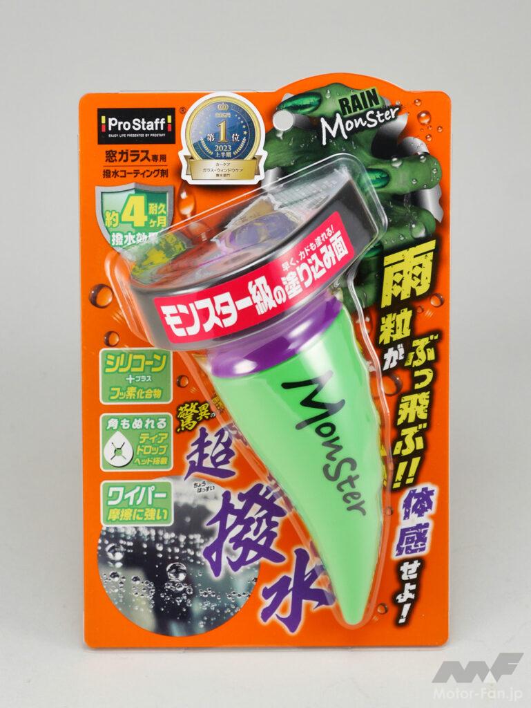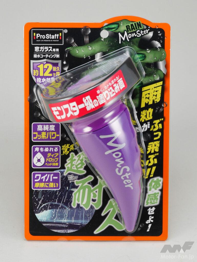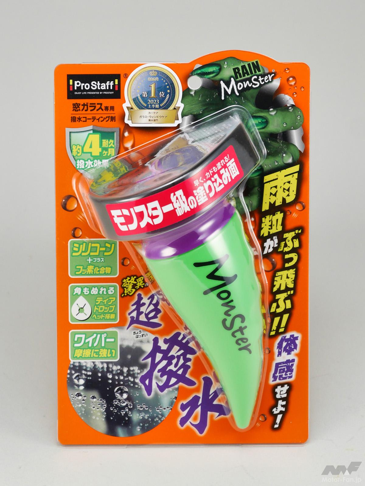 塗り込みタイプの窓ガラス用撥水コーティング剤、レインモンスター『スプラッシュ』は、シリコーンとフッ素化合物を組み合わせたハイブリッド処方により、雨粒がぶっ飛ぶ超撥水が約4ヵ月持続する。
