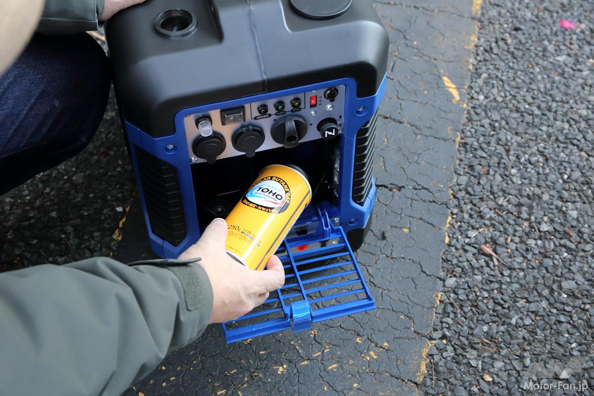 使用方法は電源をオンにしてチョークを引き、リコイルスターターを勢いよく引っ張ればエンジンが始動と、一般的なガソリン式発電機とほとんど変わらない。しかし燃料補給はカセットガスボンベを差し込むだけと、非常に安全に扱えるというわけだ。