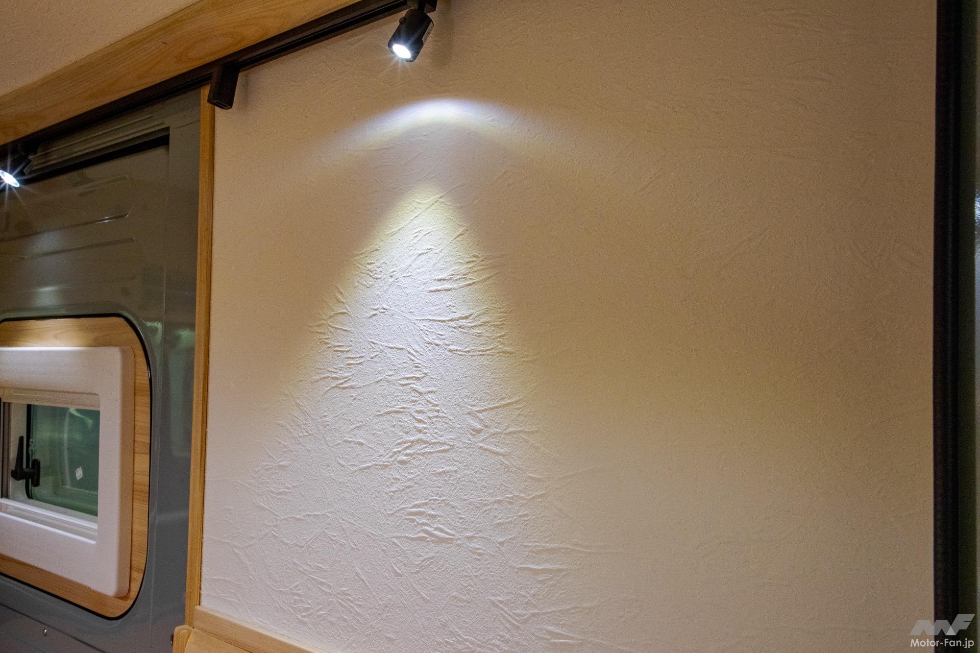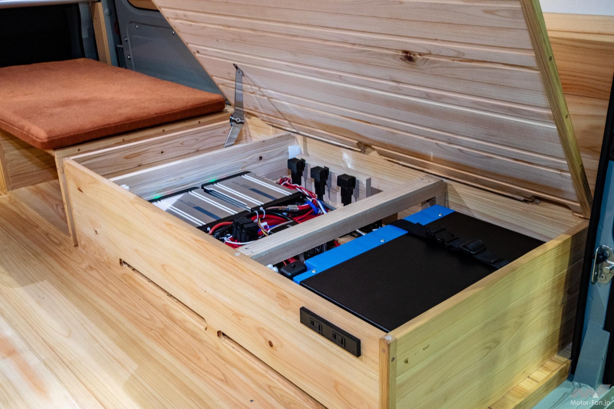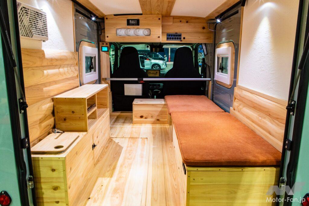 写真にある12Vクーラーはオプションで、後からリチウムサブバッテリーなどもインストールすることができる。クォッカは内部壁面がヒノキ材で覆われていたが、ジャパンディでは漆喰壁を使ったことで開放感が大幅に増大。ここがパネルバンのカーゴの中だとは想像しにくい。また空間の広さこそ限られているが、レイアウトがよりバンコンに近づいたことで、既存モデルよりもラグジュアリー感が増したようにも感じる。
