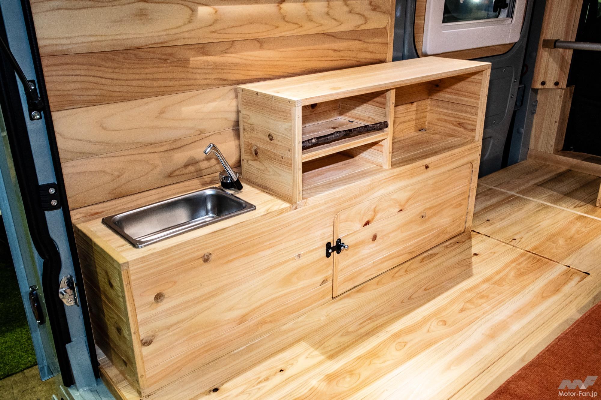 生活スタイルは多様なので一概には言えないが、ひとつの空間の中でベッド、シンク、物入れがそれぞれ独立しているインテリアは、個人的には使いやすいと思う。立って車内を移動することは難しいが、それでも歩くことができるというだけでも、長期間の車中泊のストレスを相当軽減してくれると思う。