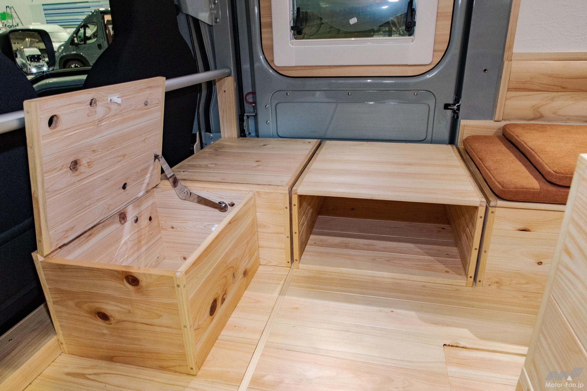 クォッカは、「ハイゼット・パネルバン」をベースに、カーゴの中をキャンピングカー仕様に改造。富士ひのきをふんだんに使い、まるでログハウスの中にでもいるような居住空間にしつらえている。また同じ木材を使ったキューブ形の家具を並べ替えることで、ベッド、テーブル、チェアにレイアウトを変えることができるのも特徴だ。これらの家具は車外で使えば、キャンプ用にも転用できる。
