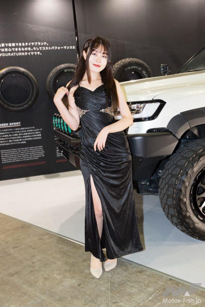 海外ブランドメーカーのタイヤ・ホイールの販売などを行うEXIZZLE-LINE。オートサロンらしい衣装を着飾った美女3人がブースを彩った。