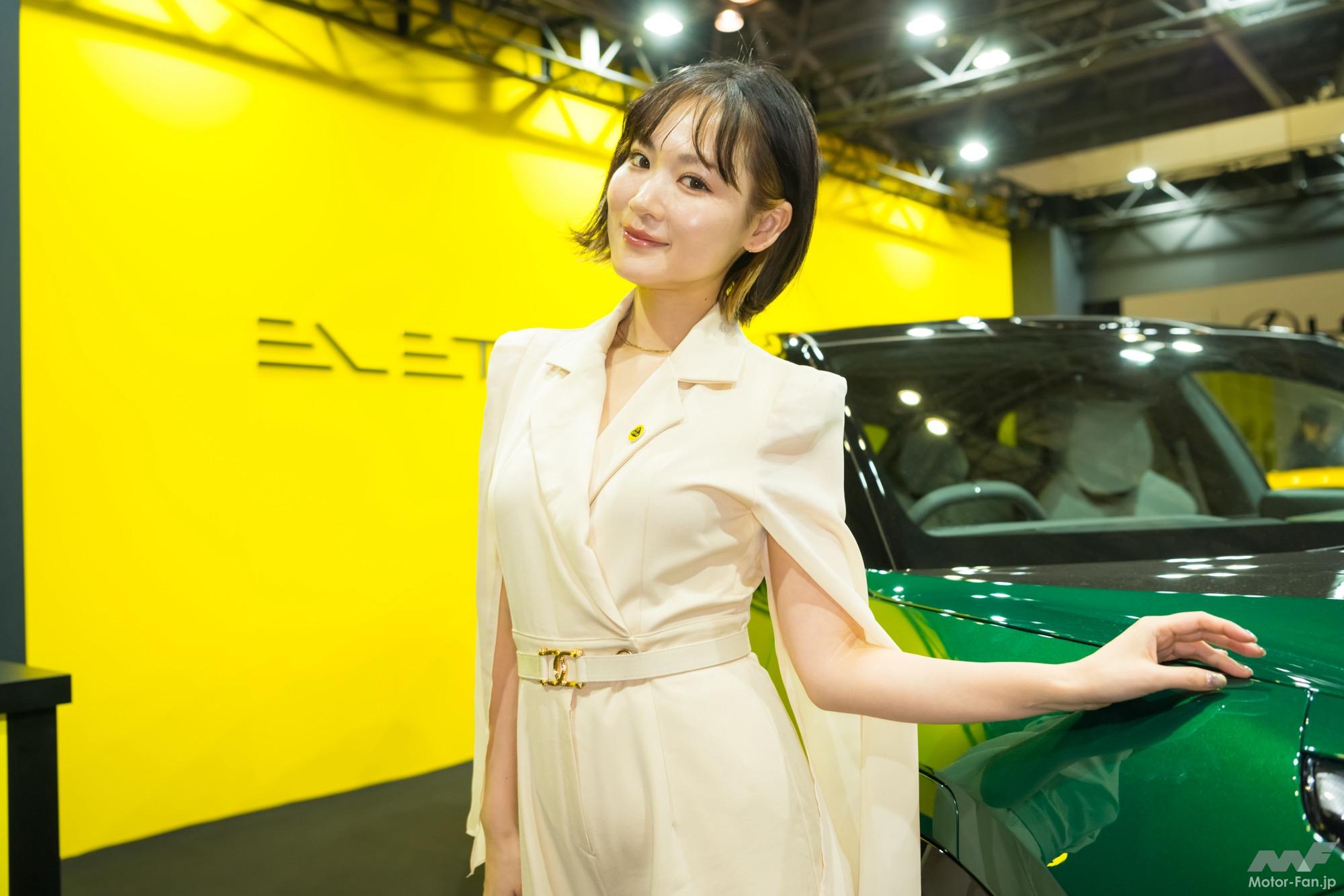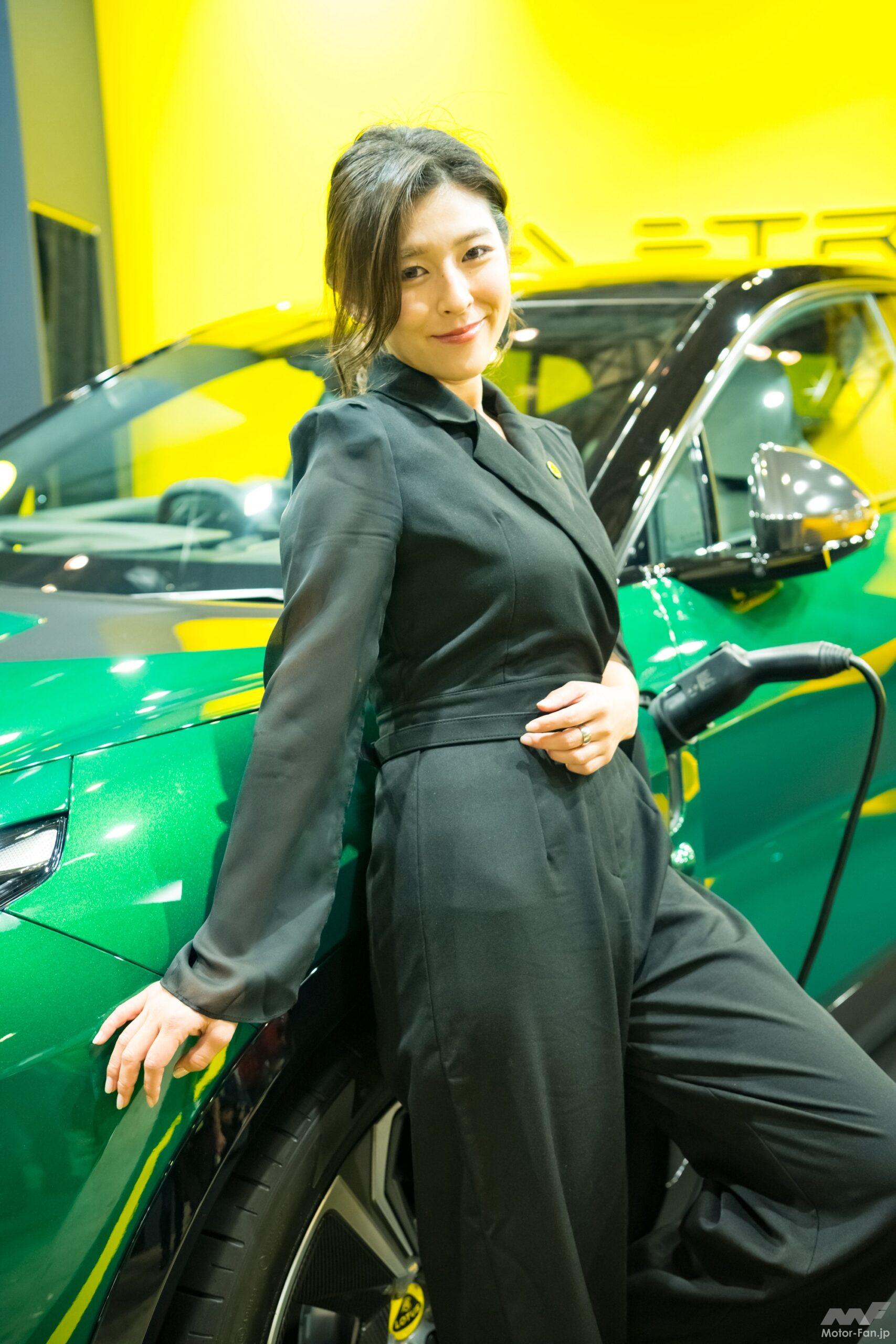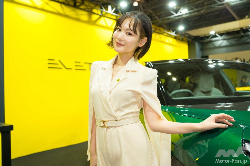 ロータスカラーで彩られたブースに展示されたロータス・エレトレ。かつてレースクイーンとして人気を博したふたりがスーツ姿で登場し盛り上げた。