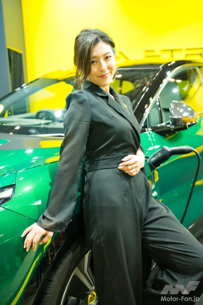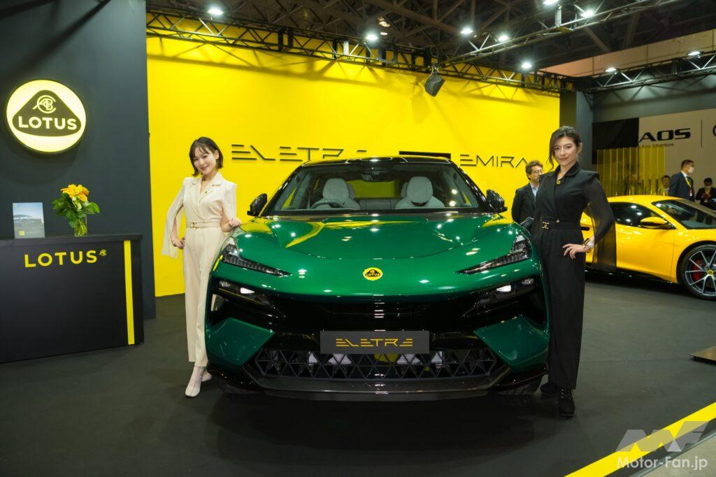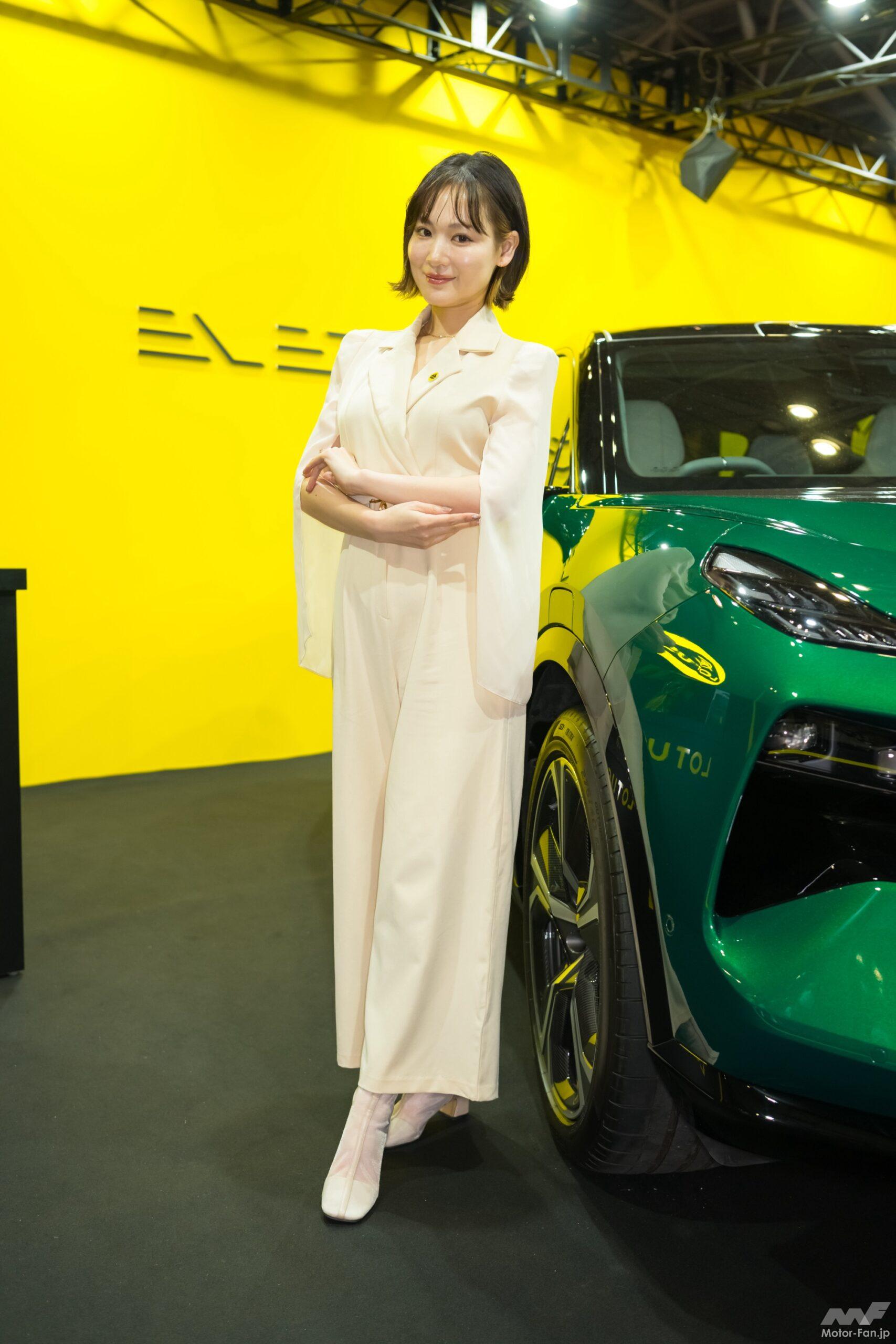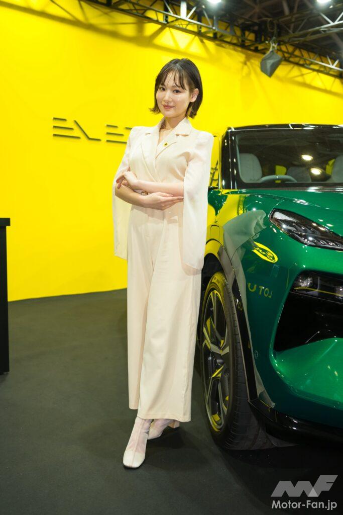 ロータスカラーで彩られたブースに展示されたロータス・エレトレ。かつてレースクイーンとして人気を博したふたりがスーツ姿で登場し盛り上げた。