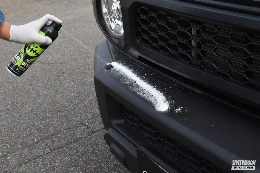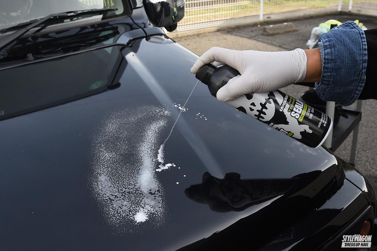 ① 汚れている箇所に直接スプレーしていく。この際、全くもって水を使わないことが洗車好きにとっては新鮮な光景に映るはずだ。